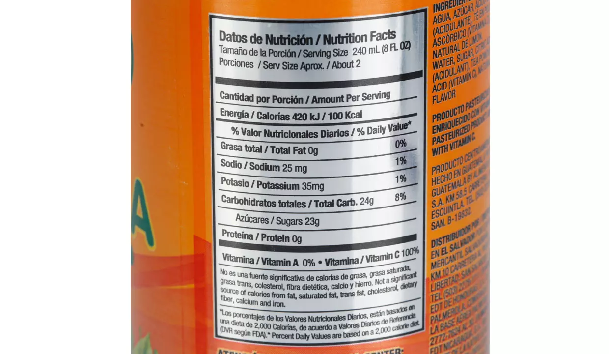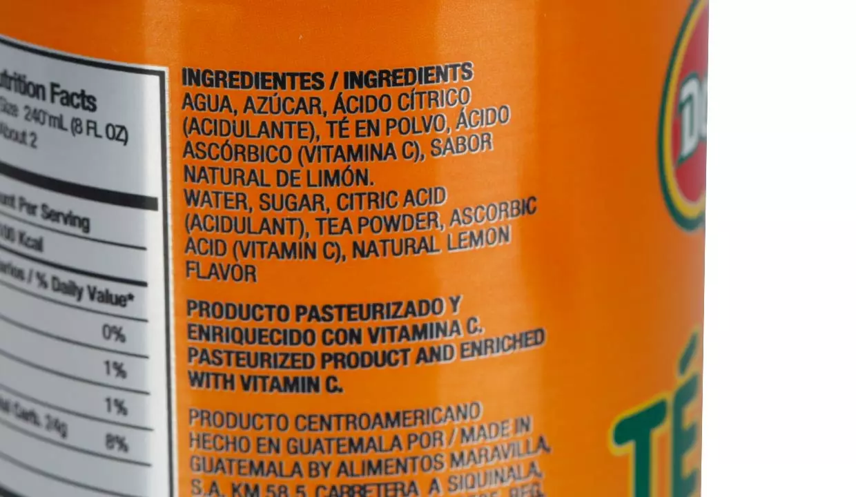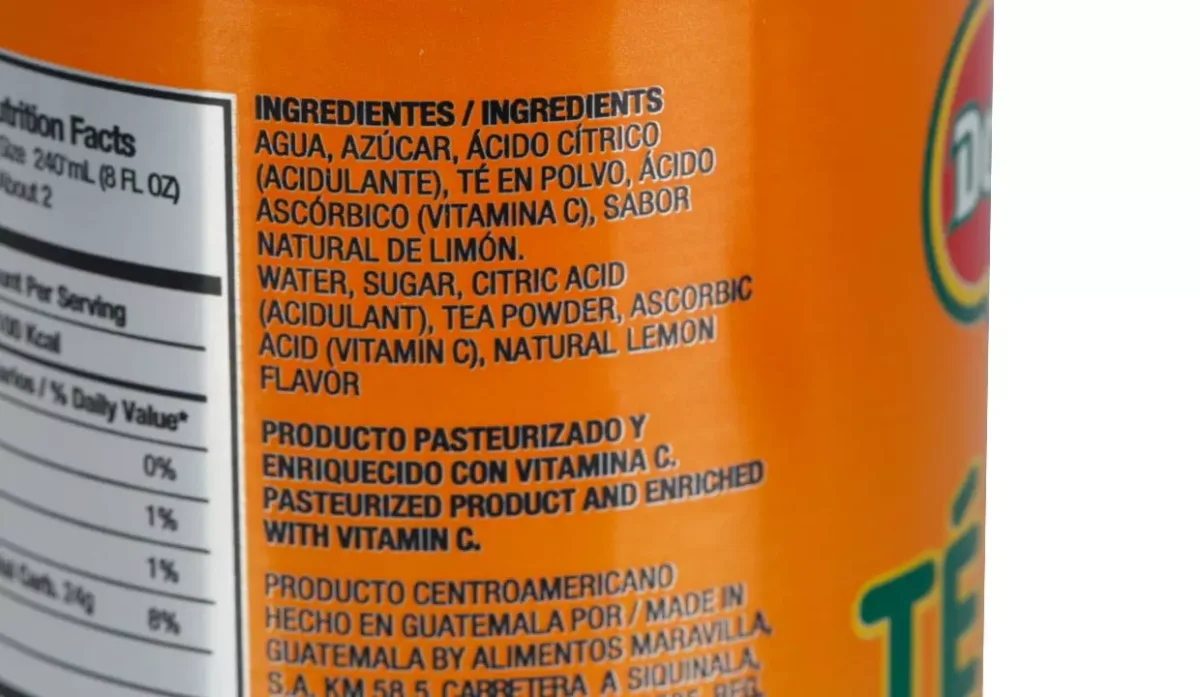 - Agua, azúcar, ácido cítrico (acidulante), té en polvo, ácido ascórbico (vitamina C), sabor natural de limón.