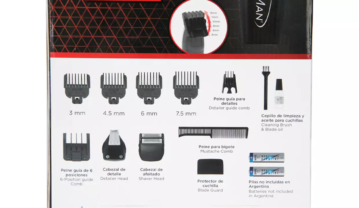 - 5 Peines guía (3mm / 4.5mm / 6mm / 7.5mm).