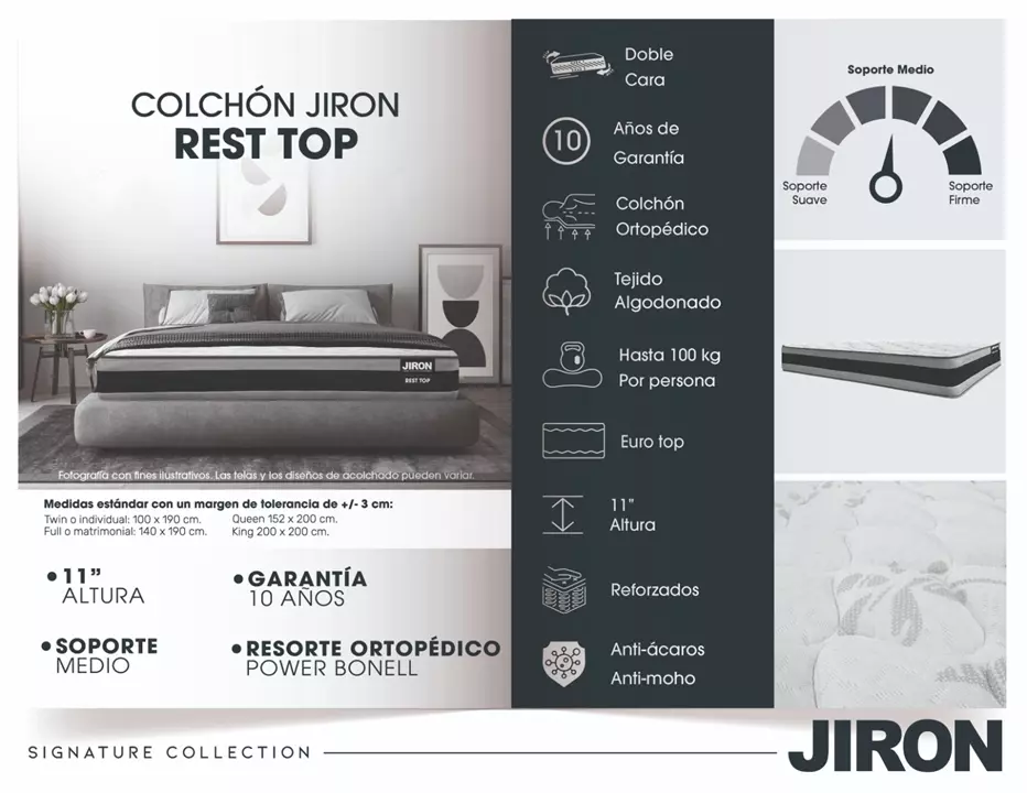 - Matrimonial: 140 cm de ancho x 190 cm de largo x 30 cm de alto.