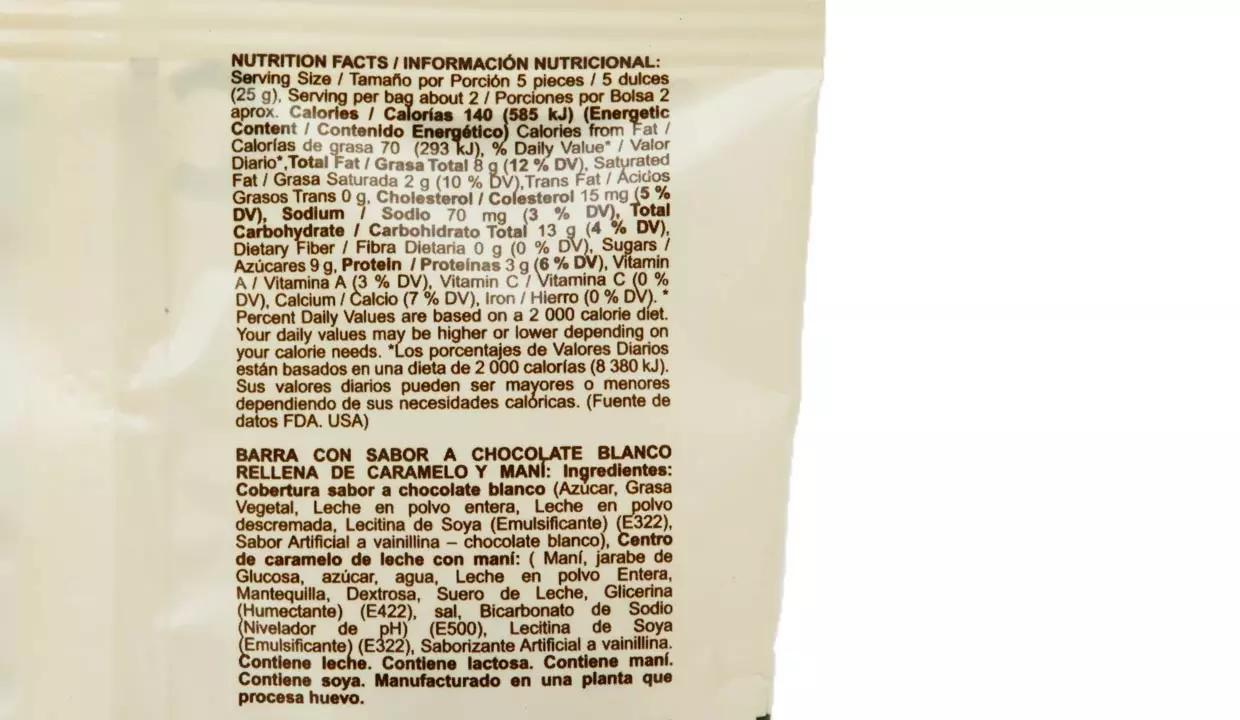 - Cobertura sabor a chocolate blanco, azúcar, grasa vegetal, leche en polvo entera, leche en polvo descremada, lecitina de soya, sabor artificial a vainilla, chocolate blanco, maní, jarabe de glucosa, mantequilla, dextrosa, suero de leche en polvo entera, bicarbonato de sodio, suero de leche,.