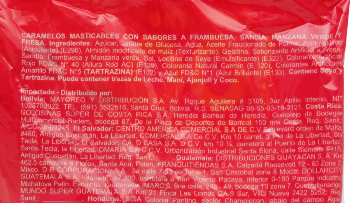 - Azúcar, jarabe de glucosa, agua, aceite fraccionado de palma, ácido málico, almidón modificado de maíz, gelatina, saborizantes artificiales, sal, lecitina de soya, colorantes artificiales.