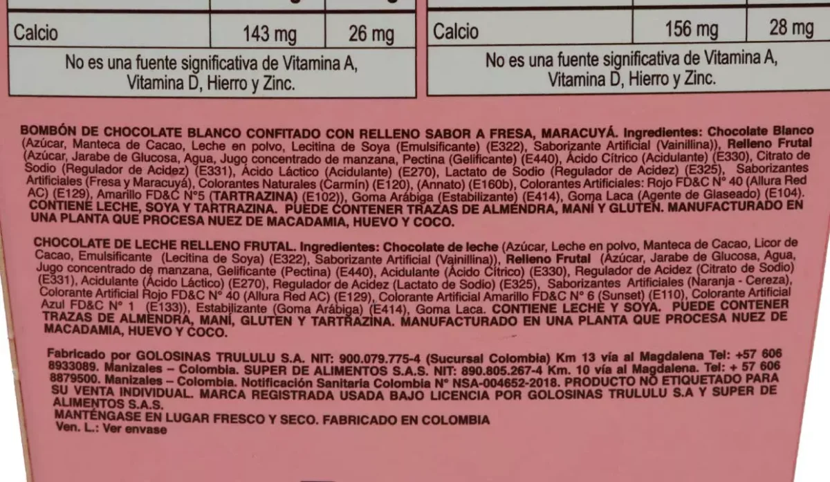 - Chocolate blanco, azúcar, manteca de cacao, leche en polvo, lecitina de soya, saborizante artificial vainilla, relleno frutal, jarabe de glucosa, agua, jugo concentrado de manzana, pectina, ácido cítrico, citrato de sodio, ácido láctico.
