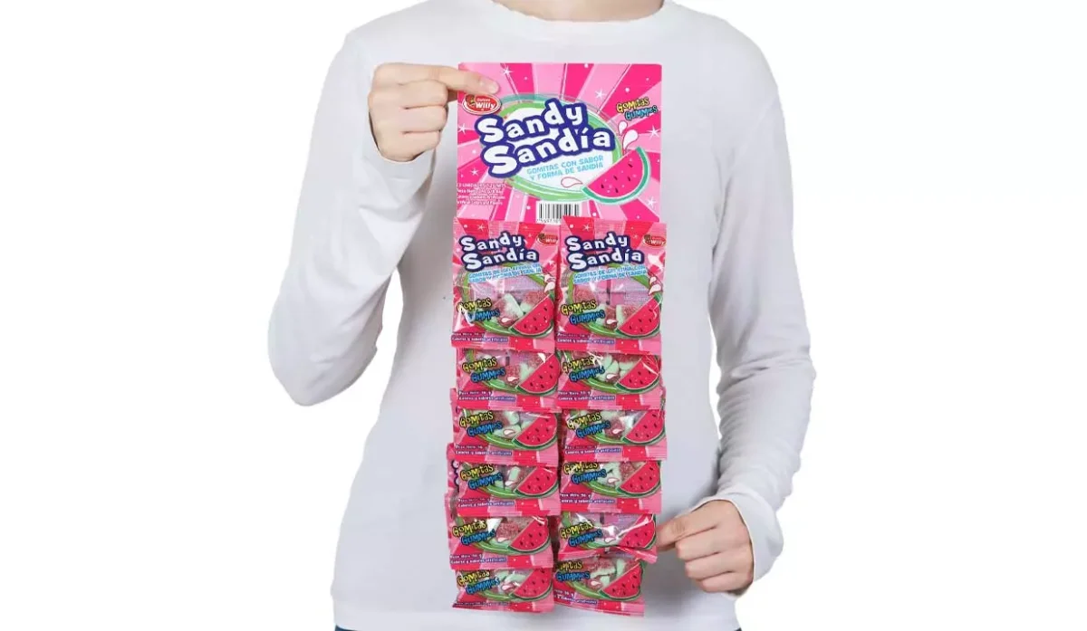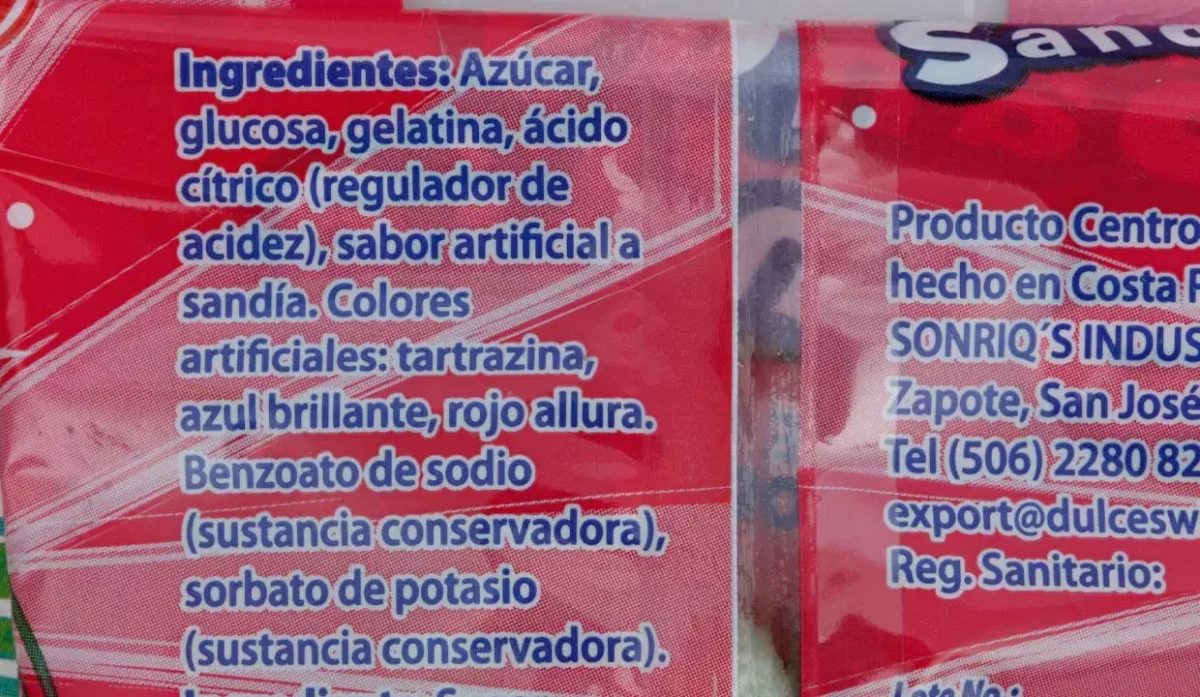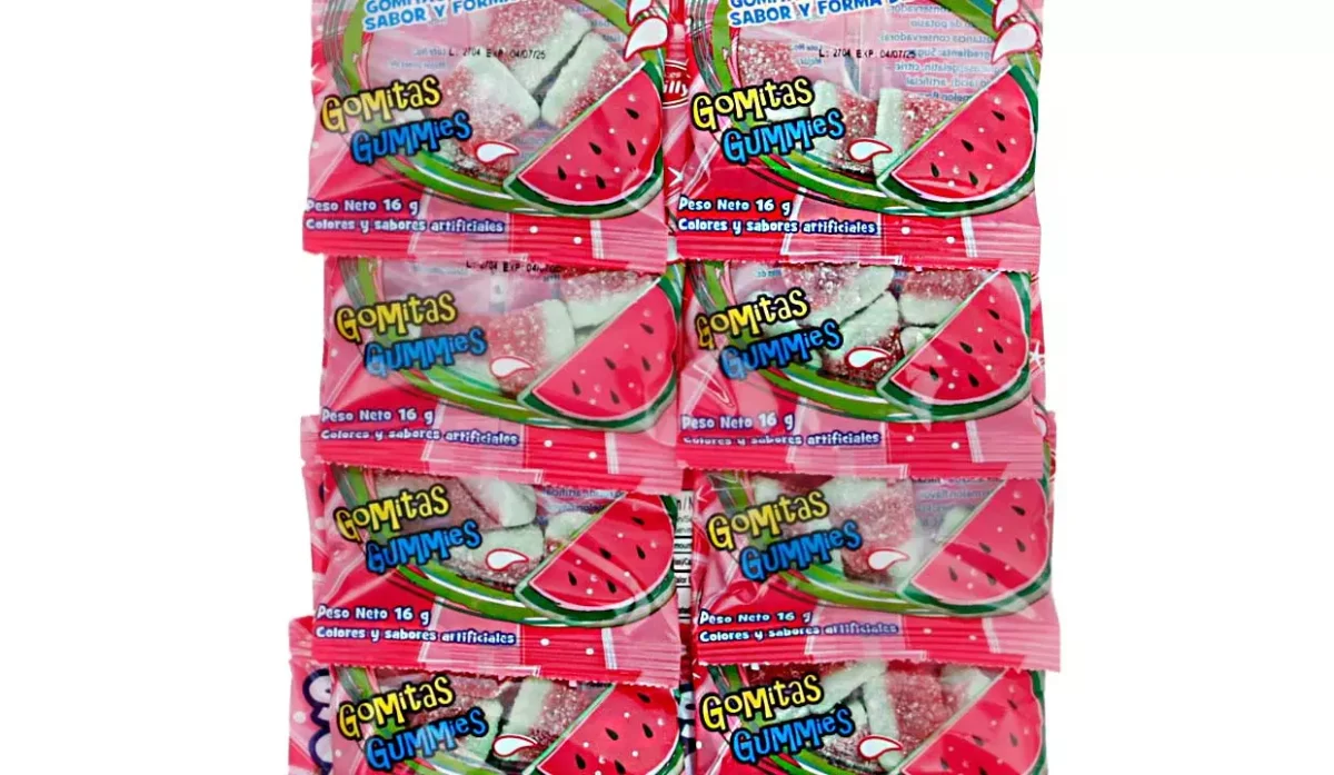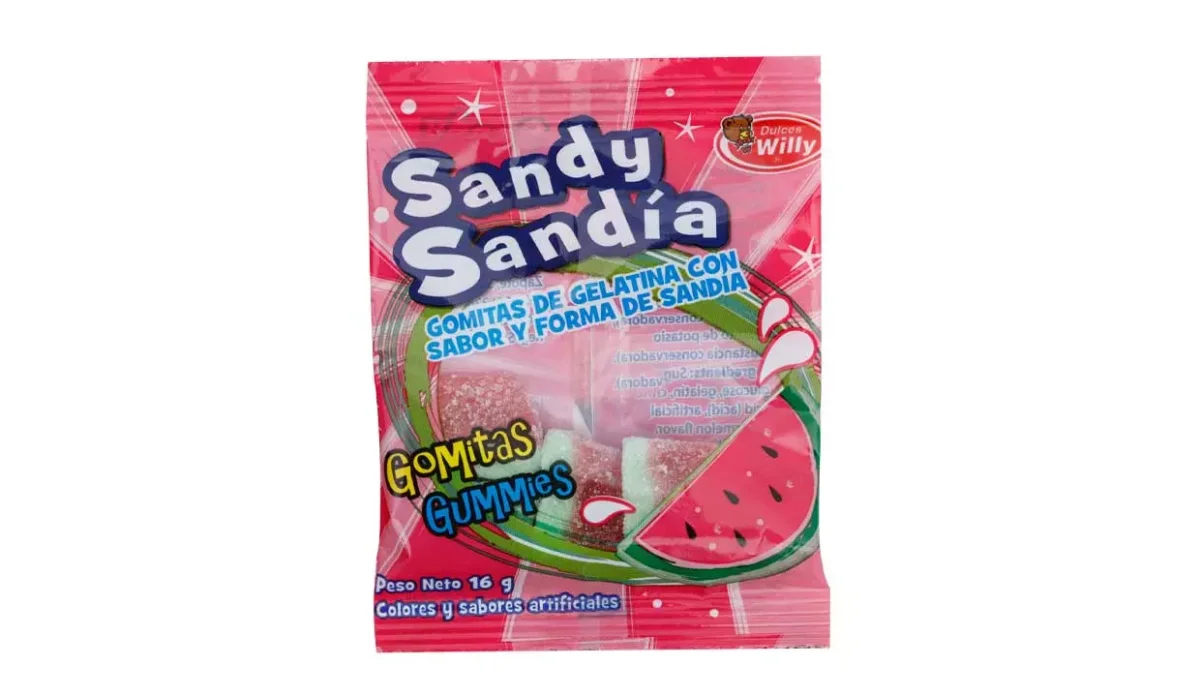 - Azúcar, glucosa, gelatina, ácido cítrico (regulador de acidez), sabor artificial a sandía, colores artificiales tartrazina, azul brillante, rojo allura, benzoato de sodio, sorbato de potasio.