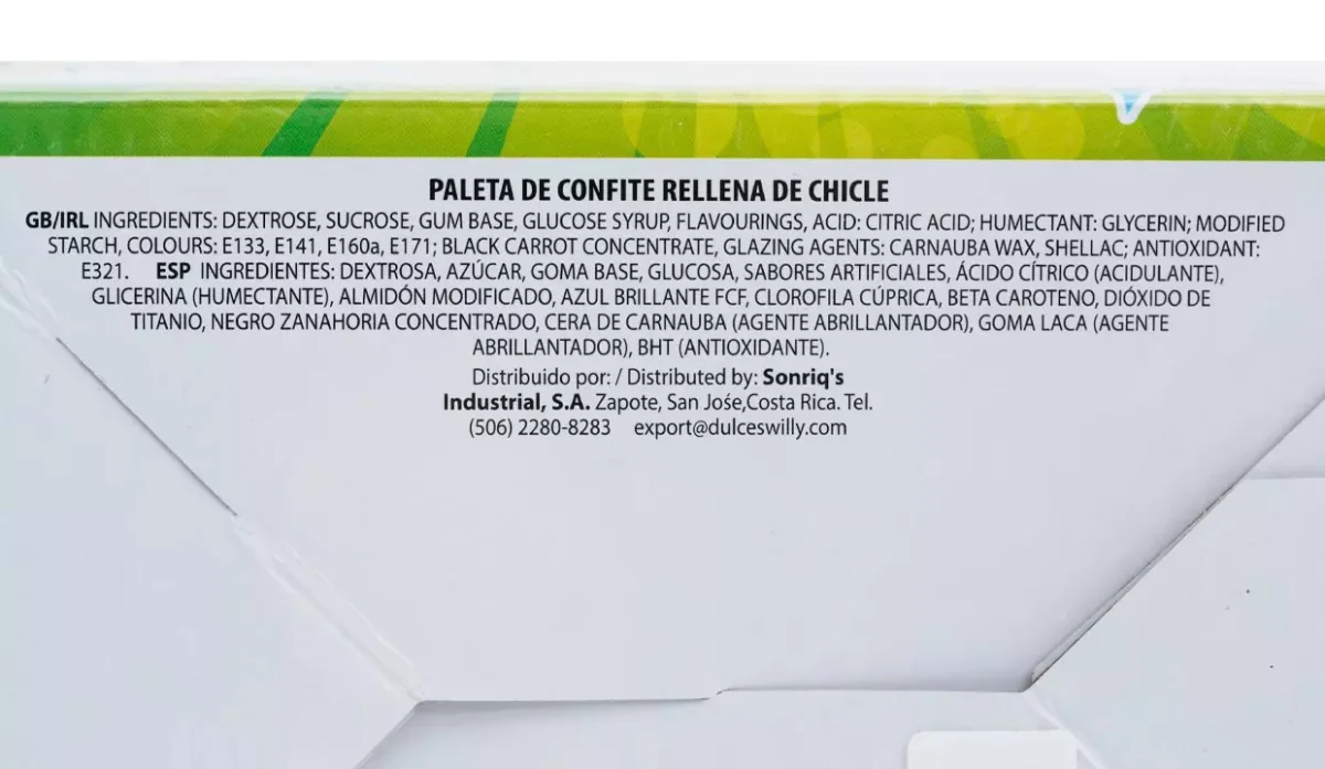 - Dextrosa, azúcar, goma base, glucosa, sabores artificiales, ácido cítrico, glicerina, almidón modificado, azul brillante, clorofila cúprica, beta caroteno, dióxido de titanio, negro zanahoria concentrado, cera de carnauba, goma laca.