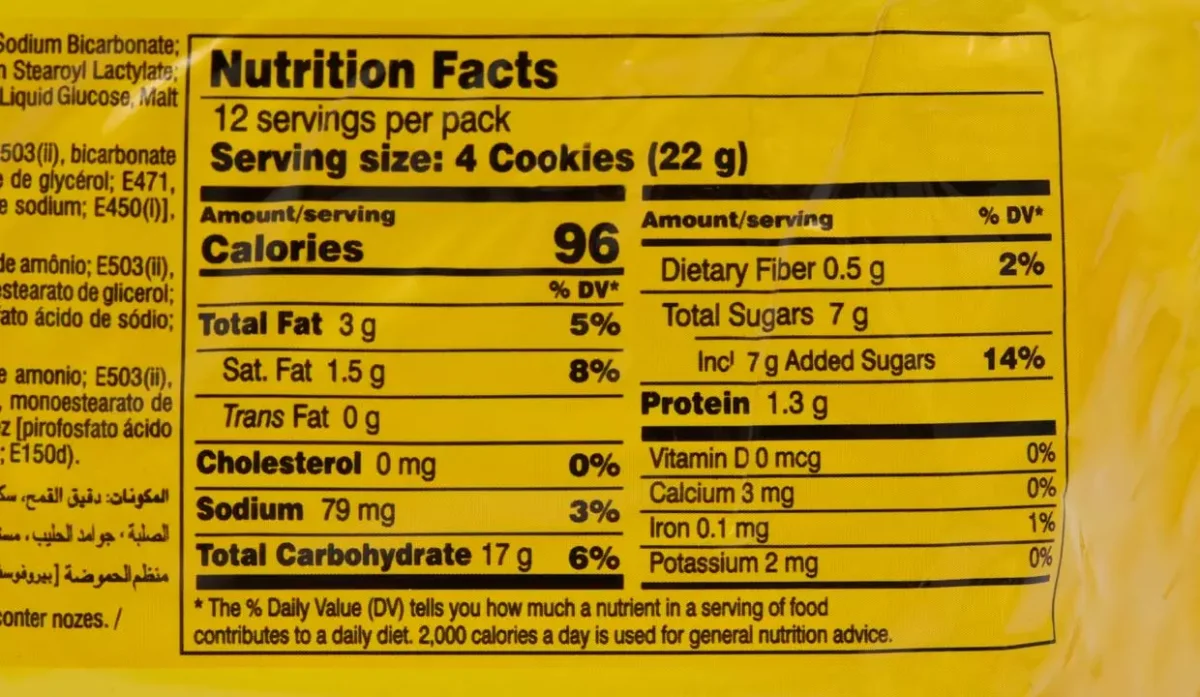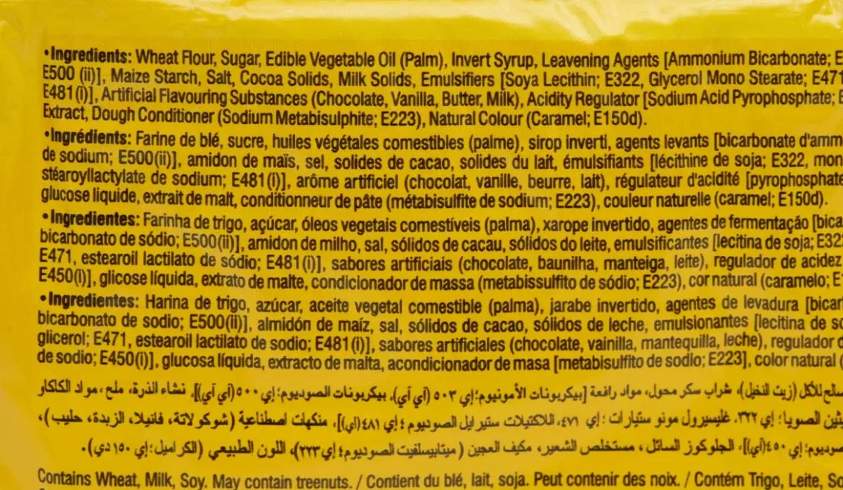 - Harina de trigo, azúcar, aceite vegetal comestible de palma, jarabe invertido, agentes de levadura, bicarbonato de amonio, bicarbonato de sodio, almidón de maíz, sal, sólidos de cacao y leche, emulsionantes, lecitina de soja, monoestearato de glicerol, esteaoril, lactilato de sodio, sabores artificiales a chocolate, vainilla, mantequilla y leche, regulador de acidez , pirofosfato ácido de sodio, glucosa líquida, extracto de malta, acondicionador de masa y metabisulfito de sodio.