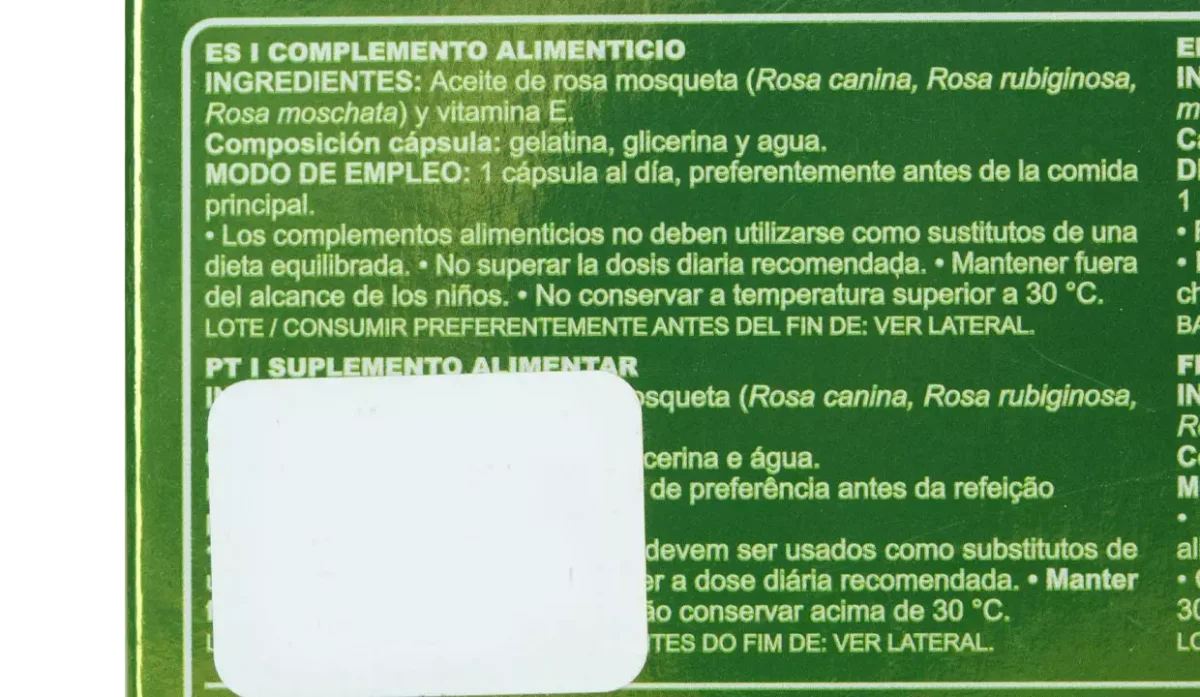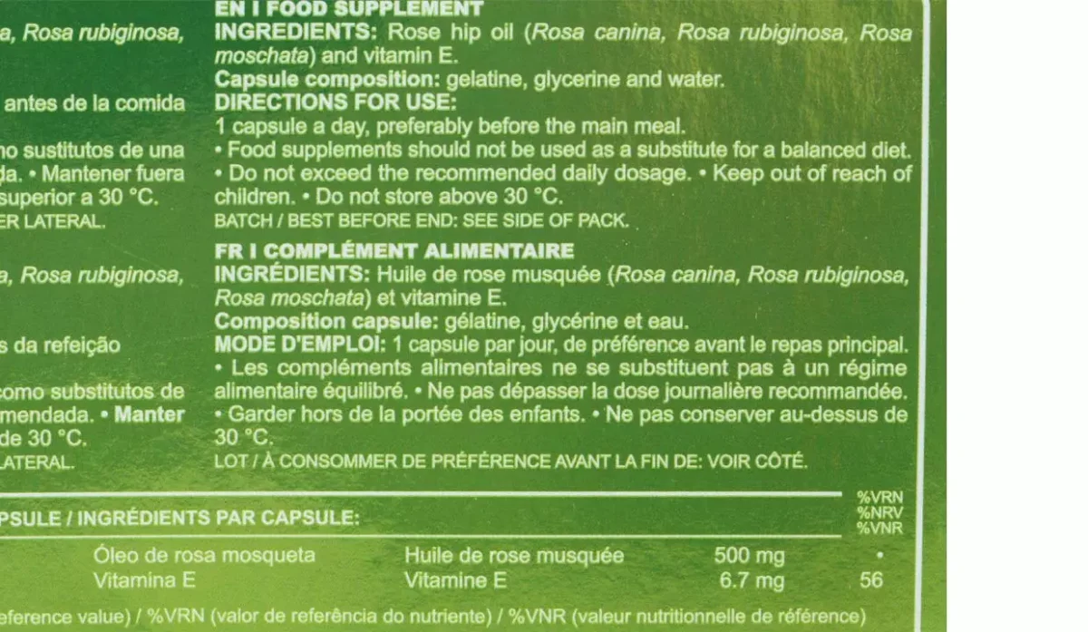 - Aceite de rosa mosqueta (rosa canina, rosa rubiginosa, rosa moschata) y vitamina E.