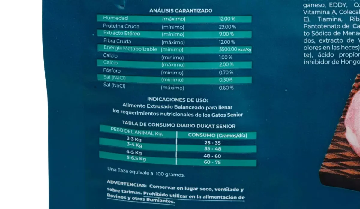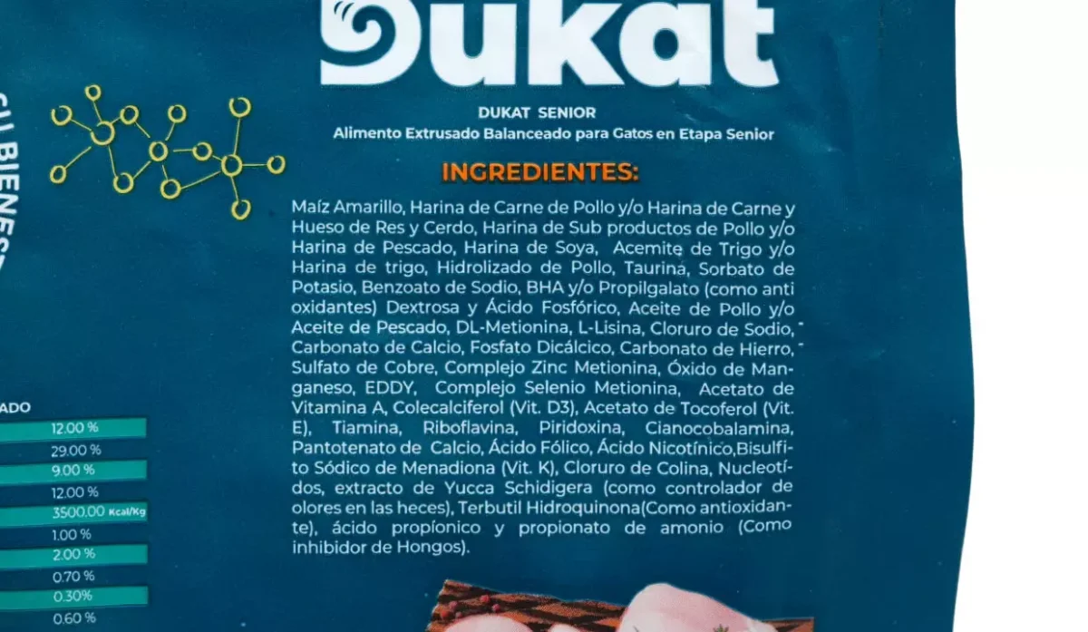 - Maíz amarillo, harina de carne de pollo y/o harina de carne y hueso de res y cerdo, harina de sub productos de pollo y/o harina de pescado, harina de soya, acemite de trigo y/o harina de trigo, hodrolizado de pollo, taurina, sorbato de potasio, benzoato de sodio, BHA y/o propilgalato, dextrosa y ácido fosfórico, aceite de pollo y/o aceite de pescado, DL metionina, l lisina, cloruro de sodio, carbonato de calcio, fosfato dicálcico, carbonato de hierro, sulfato de cobre, complejo zinc metionina.