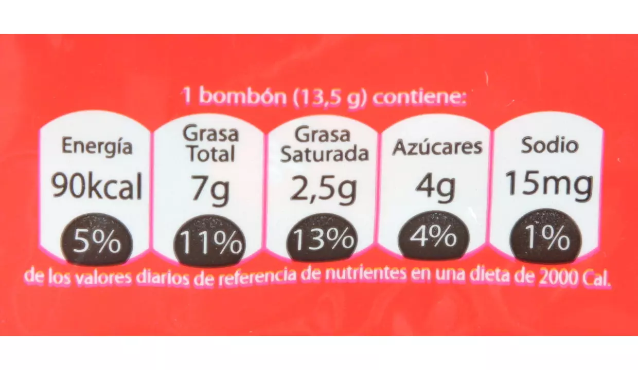 - Relleno de caramelo suave derretido (jarabe de glucosa, azúcar, grasa vegetal, leche entera en polvo, humectante (sorbitol), emulsionante (lecitina de soja), sal, regulador de la acidez (carbonato de sodio) y sabor natural (crema de caramelo)).