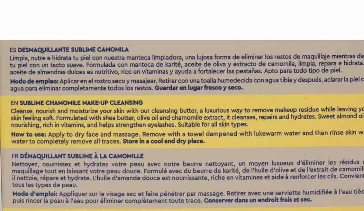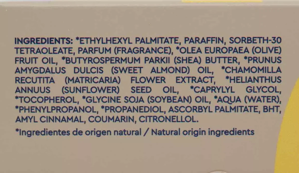 - Formulada con manteca de karité, aceite de oliva y extracto de camomila.