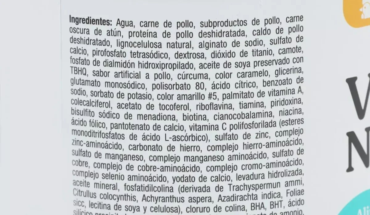 - Agua, carne oscura de atún, carne de pollo, subproductos de pollo, proteína de pollo deshidratada, caldo de pollo deshidratado, lignocelulosa natural, alginato de sodio, sulfato de calcio, pirofosfato tetrasódico, destrosa, dióxido de titanio, manzana fosfato de almidón hidroxipropilado, sabor artificial a pollo cúrcuma, sorbato de potasio, aceite de soya preservado con TBHQ, sabor artificial a pollo, cúrcuma, color caramelo, glicerina, glutamato monosódico, polisorbato.
