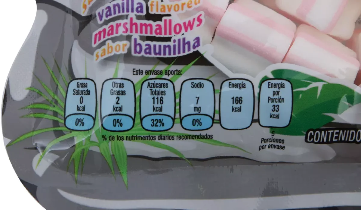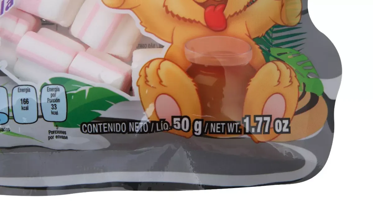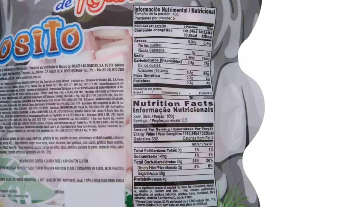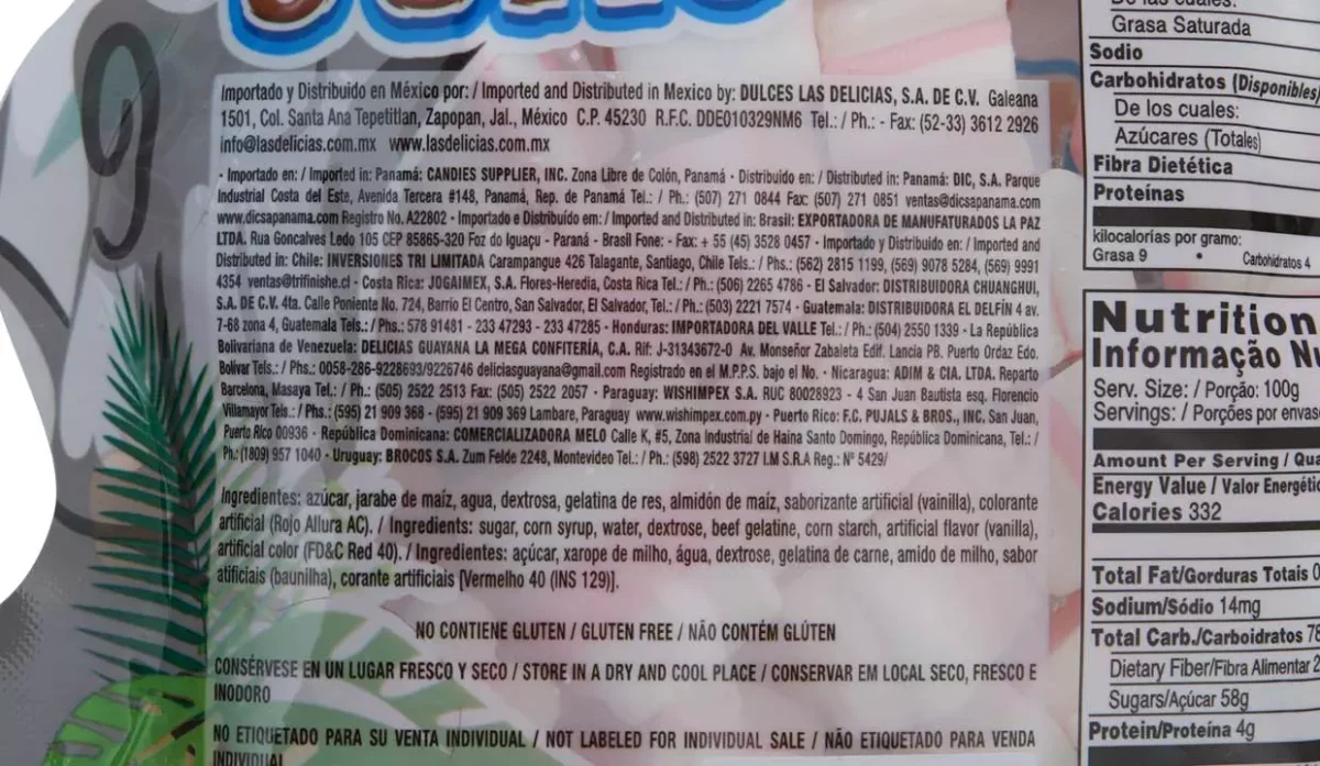 - Azúcar, jarabe de maíz, agua, dextrosa, gelatina de res, almidón de maíz, saborizante artificial a vainilla, colorante artificial rojo altura AC.