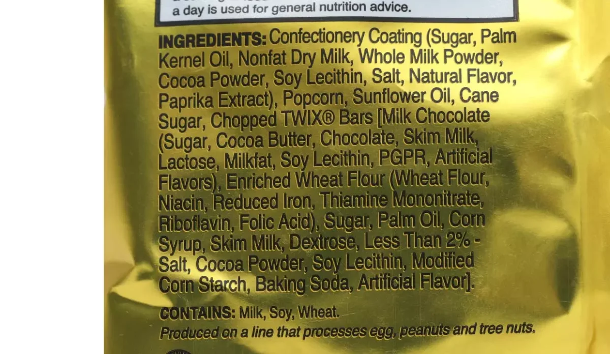 - Cobertura de confitería, azúcar, aceite de palmiste, leche en polvo descremada, leche entera en polvo, cacao en polvo, lecitina de soja, sal, sabor natural, extracto de pimentón, palomitas de maíz, aceite de girasol, azúcar de caña, barras twix picadas, chocolate con leche, azúcar, manteca de cacao , chocolate, leche desnatada, lactosa, grasa láctea, lecitina de soja, saborizantes artificiales, harina de trigo enriquecida, harina de trigo, niacina, hierro reducido, mononitrato de tiamina.