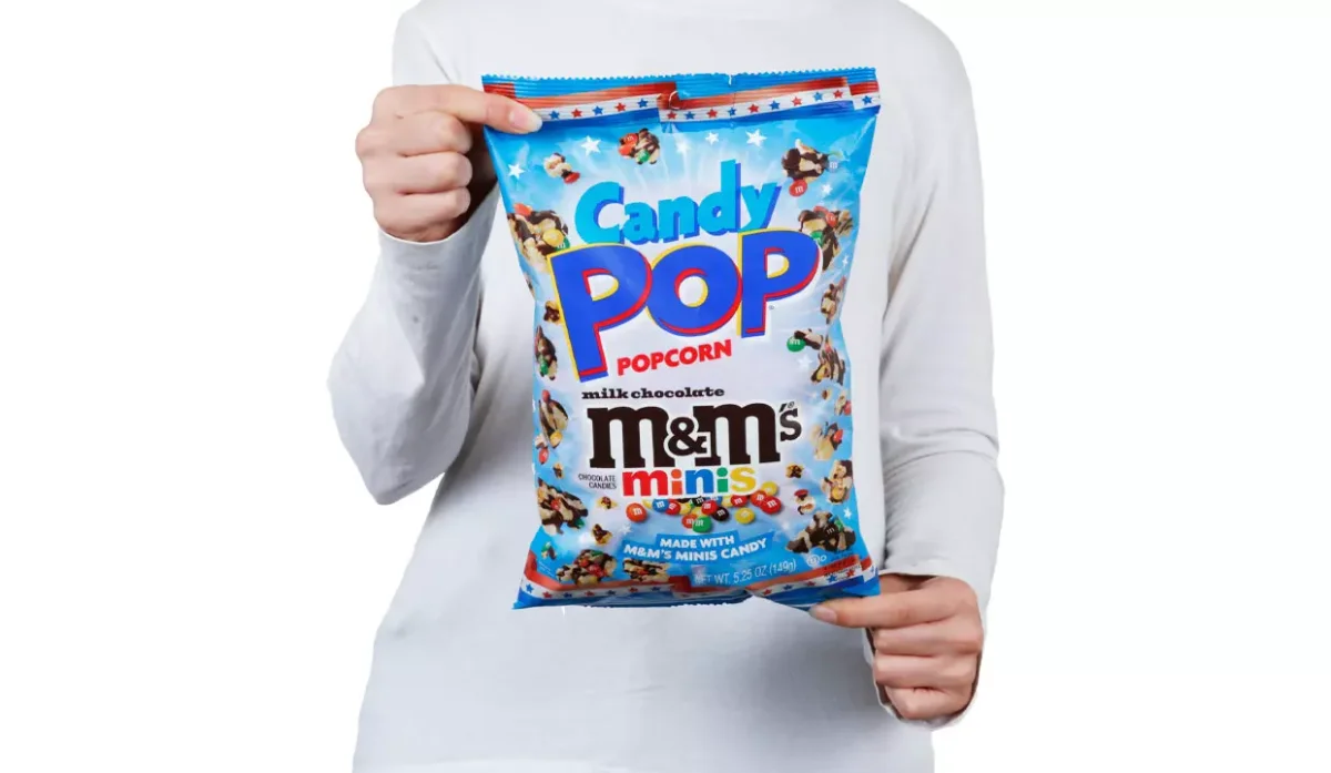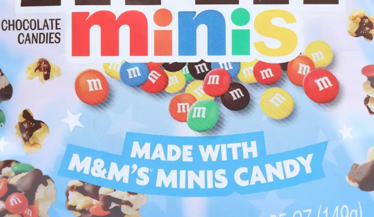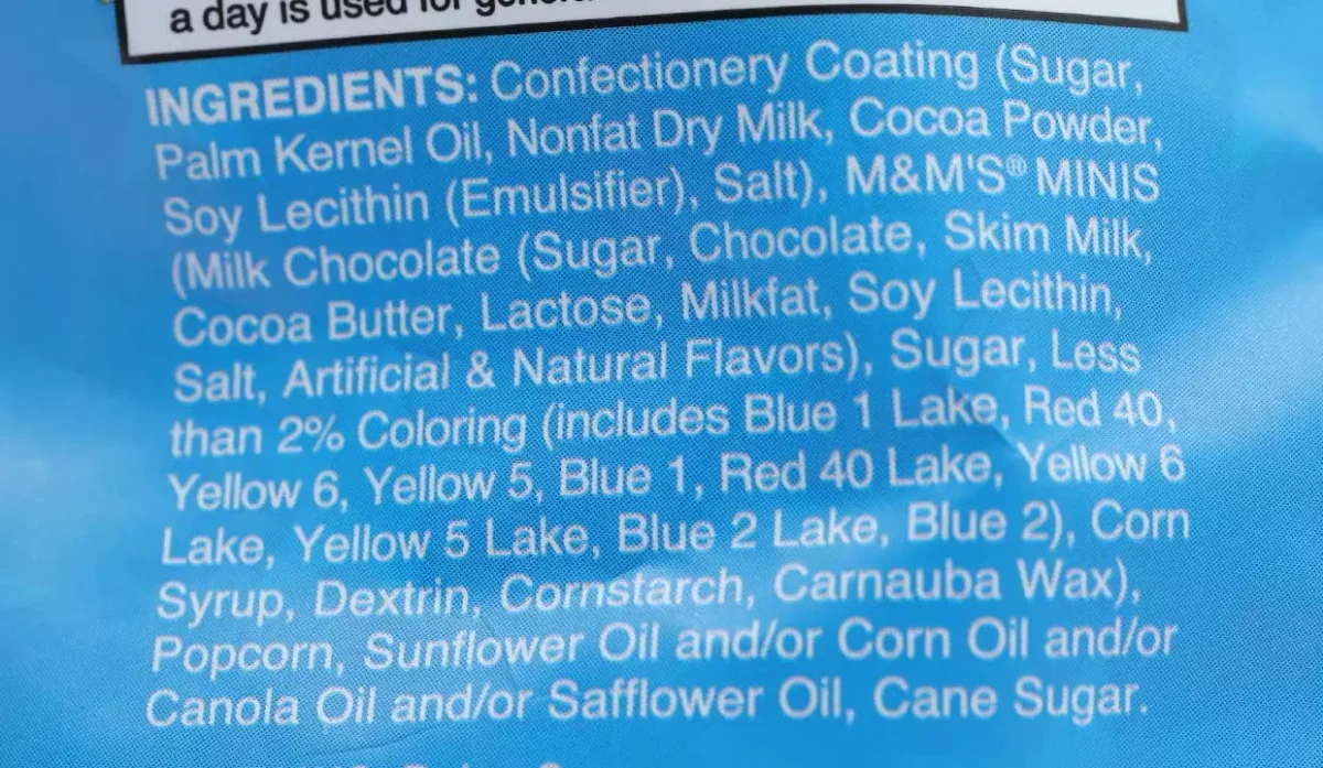 - Cobertura de confitería, azúcar, aceite de palma kemel, leche en polvo descremada, cacao en polvo, lecitina de soja, emulsionante, sal, m&m minis, chocolate con leche, azúcar, chocolate, leche desnatada, manteca de cacao, lactosa, grasa de leche, lecitina de soja, sal, artificial y sabores naturales, azúcar, menos del 2 %, los colorantes incluyen azul 1, laca, rojo 40, amarillo 6, amarillo 5 laca, azul 2 laca, azul 2, jarabe de maíz, dextrina, maicena, cera de carnauba, palomitas de maíz.