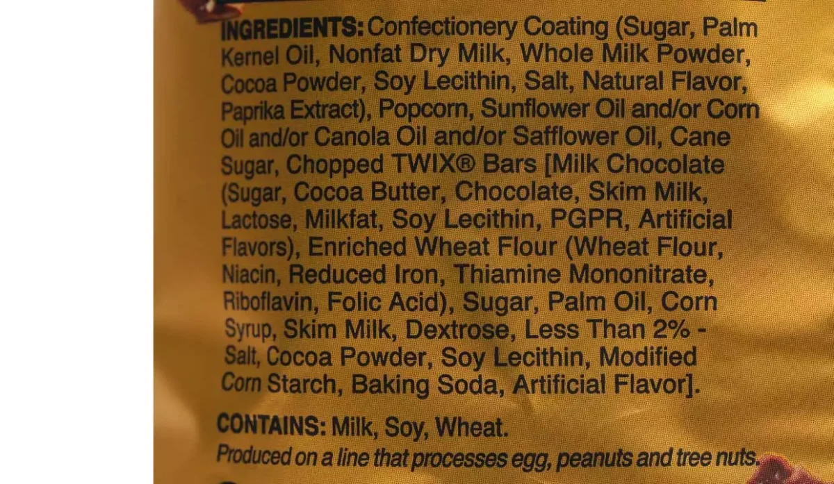 - Cobertura de confitería, azúcar, aceite de palmiste, leche en polvo descremada, leche entera en polvo, cacao en polvo, lecitina de soja, sal, sabor natural, extracto de pimentón, palomitas de maíz, aceite de girasol, azúcar de caña, barras twix picadas, chocolate con leche, azúcar, manteca de cacao , chocolate, leche desnatada, lactosa, grasa láctea, lecitina de soja, saborizantes artificiales, harina de trigo enriquecida, harina de trigo, niacina, hierro reducido, mononitrato de tiamina.