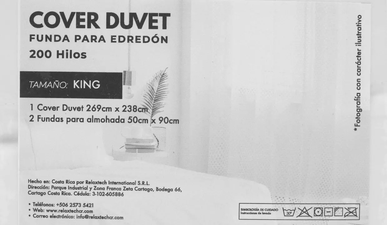 - Gratis cover duvet de 269 cm de ancho x 238 cm de largo, 2 fundas para almohada de 50 cm de ancho x 90 cm de largo.