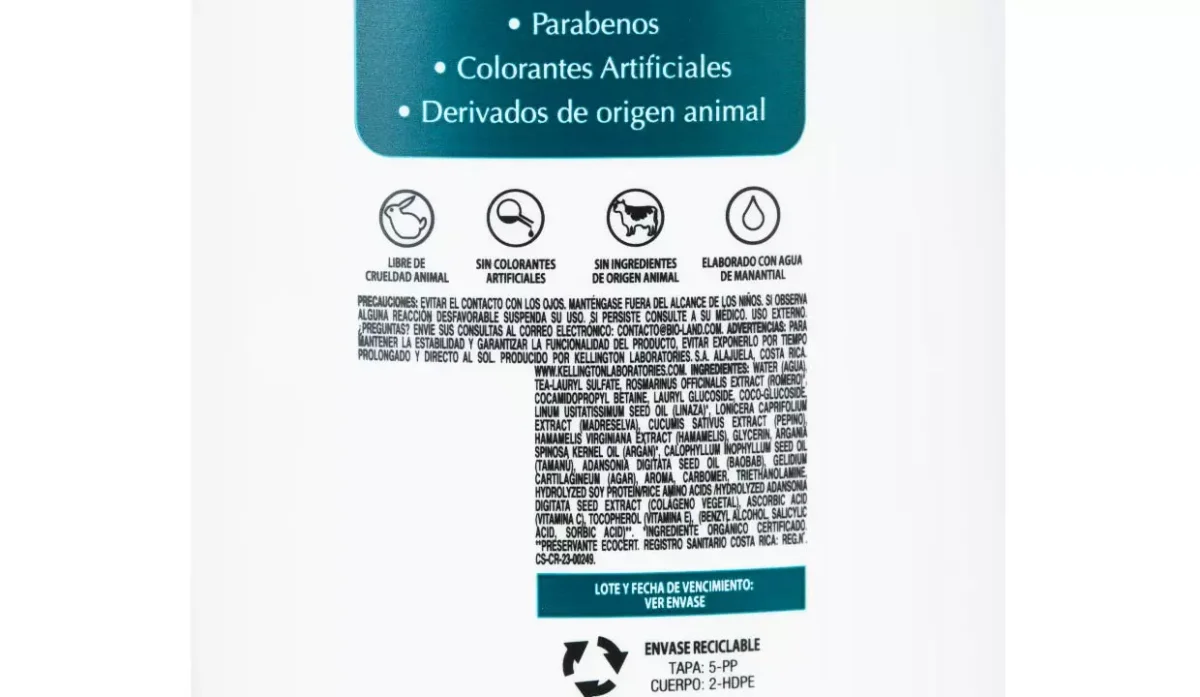 - No contiene: sal, siliconas, lauril sulfato de sodio, parabenos, colorantes artificiales, derivados de origen animal.