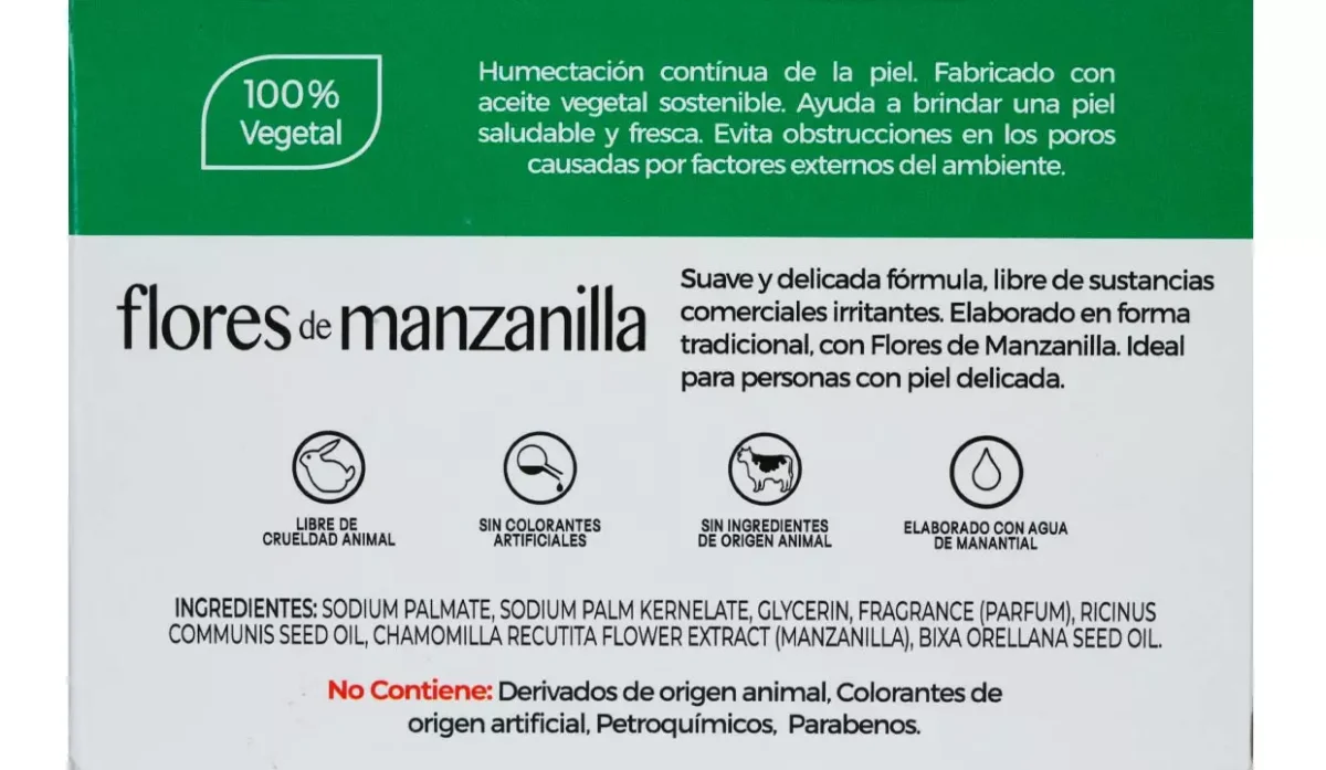 - No contiene: derivados de origen animal, colorantes de origen artificial, petroquímicos y parabenos.