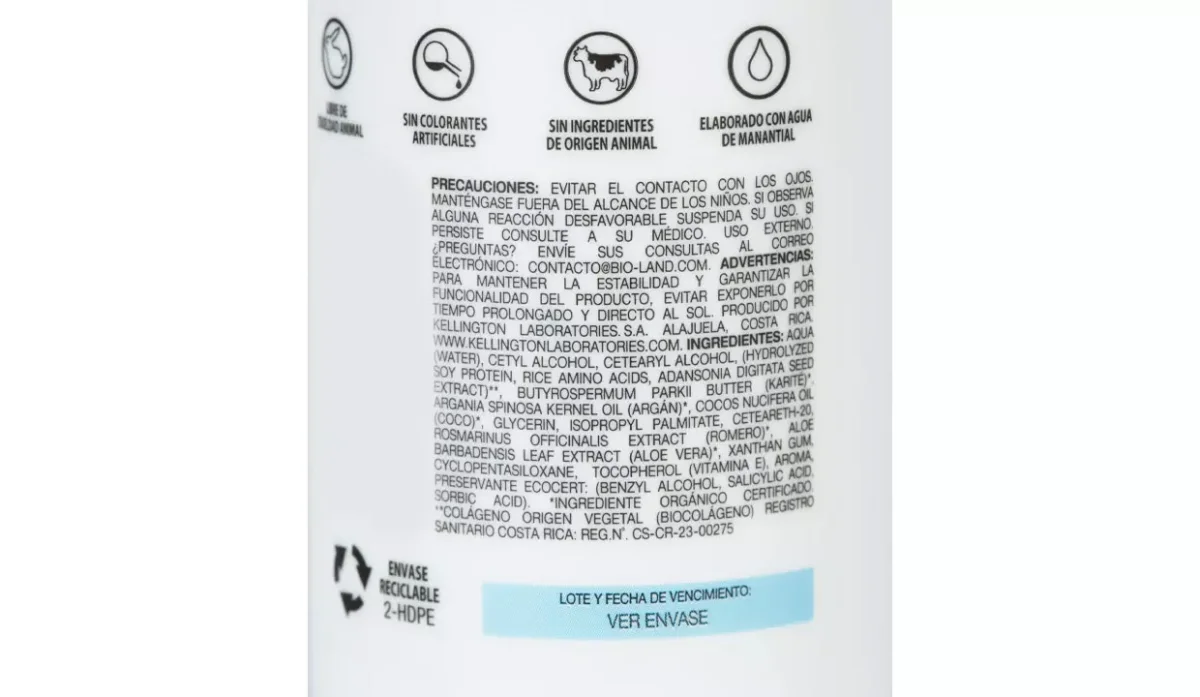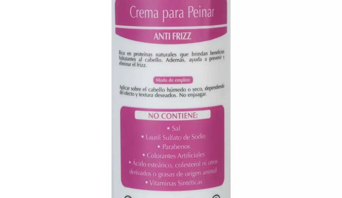 - No contiene: sal, lauril sulfato de sodio, parabenos, colorantes artificiales, ácido esteárico, colesterol ni otros derivados o grasas de origen animal, vitaminas sintéticas.