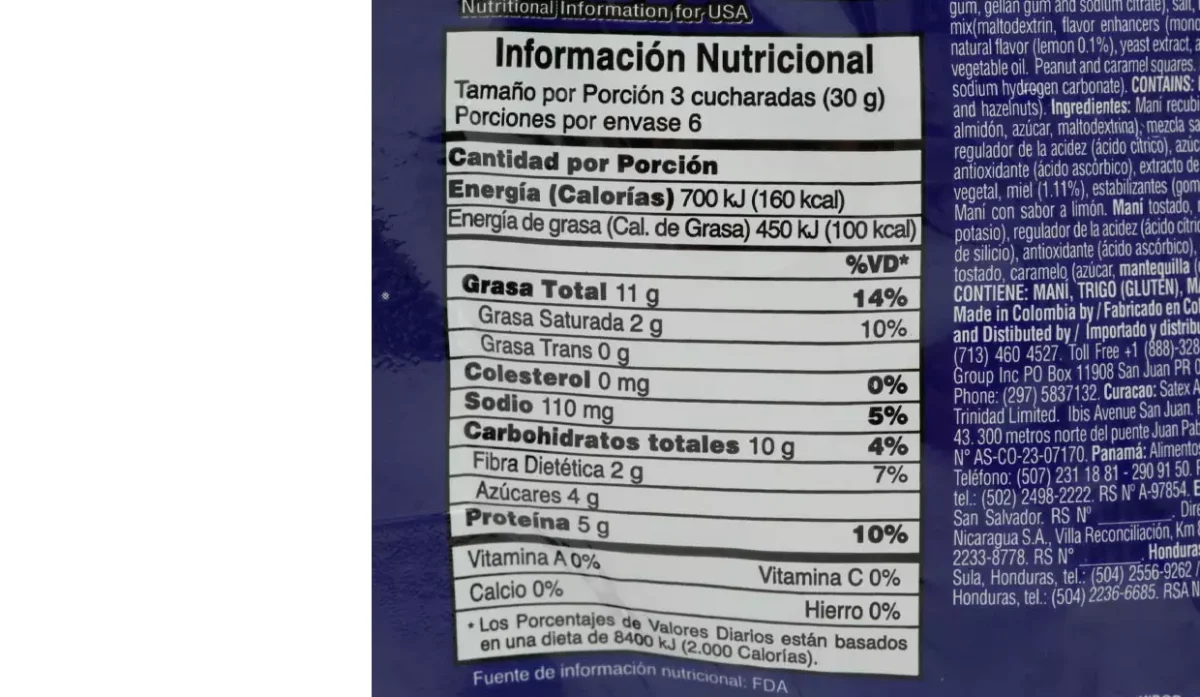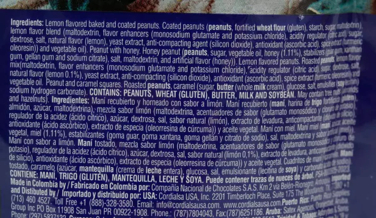 - Maní recubierto y horneado con sabor a limón, harina de trigo fortificada, almidón, azúcar, maltodextrina, mezcla sabor limón, acentuadores de sabor, glutamato monosódico, cloruro de potasio, regulador de acidez, ácido cítrico, azúcar, dextrosa, sal, sabor natural limón, extracto de levadura, anticompactante, dióxido de silicio, antioxidante , ácido ascórbico, extracto de especia, aceite vegetal, maní con miel, maní con sabor a limón, maní tostado, mezcla sabor limón.