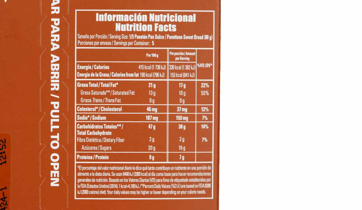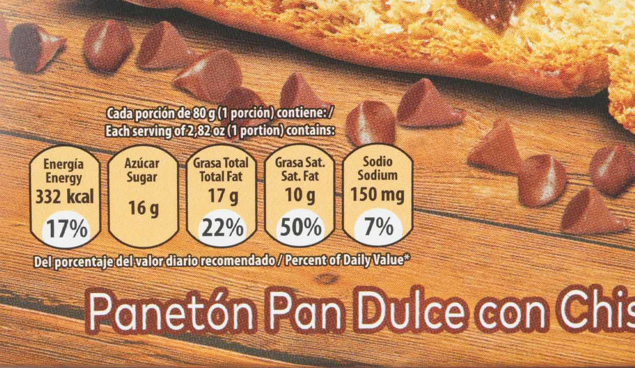 - Harina de trigo fortificada, hierro, niacina, vitamina B1, B2, ácido fólico, manteca vegetal de palma, chispas sabor a chocolate, azúcar, suero de leche en polvo, cacao en polvo, leche entera en polvo, emulsionantes, lecitina de soya, ésteres poliglicéridos de ácido ricinoléico interesterificado, saborizantes artificiales, yema de huevo, colorante, gluten de trigo, emulsionantes, monoglicéridos y diglicéridos de ácidos grasos, esteaoril lactilato de sodio, esteres diacetitartáricos.