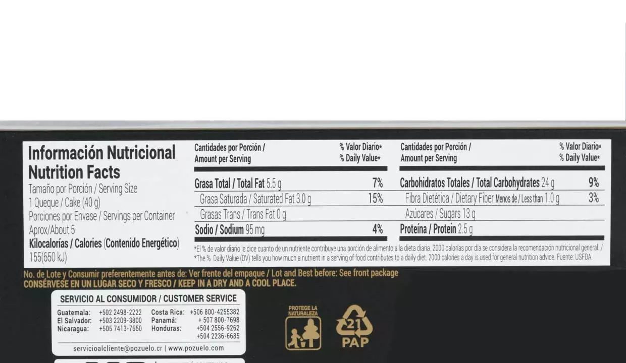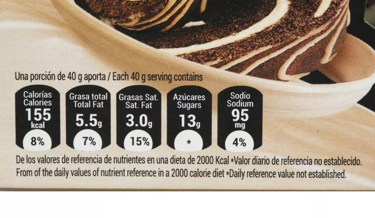 - Azúcar, harina de trigo enriquecida, niacina, hierro , tiamina, riboflavina, ácido fólico, grasa vegetal, fructosa, leche en polvo, sorbitol, huevo, etanol, cocoa alcalina, suero de leche en polvo, emulsificantes, lecitina de soya, propilenglicol, monoesterato de glicerina, polirricinoleato e hidroxido de sodio, sal, leudante, polvo de hornear, saborizantes artificiales, colorante natural color caramelo, mezcla vitamínica con hierro, vitamina B1, vitamina A, preservante ácido sórbico, goma xantá.