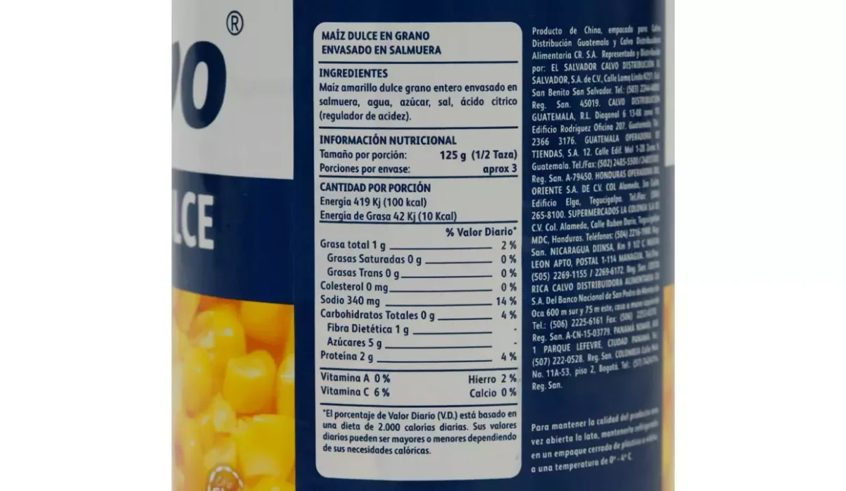 - Maíz amarillo dulce en grano entero envasado en salmuera, agua, azúcar, sal, ácido cítrico (regulador de acidez).