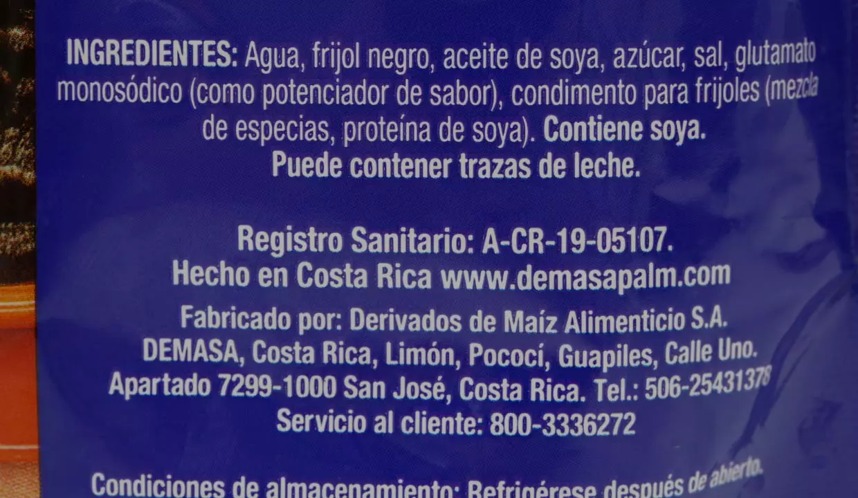 - Agua, frijol negro, aceite de soya, azúcar, sal, glutamato monosódico como potenciador de sabor, condimento para frijoles, mezcla de especias y proteína de soya.