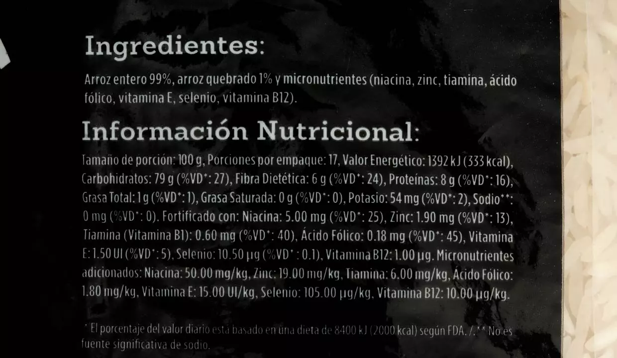 - Arroz entero 99%, arroz quebrado 1% y micronutrientes. niacina, zinc, tiamina, ácido fólico, vitamina E, selenio y vitamina B12.