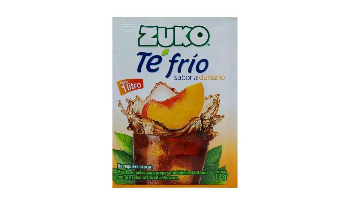 - Mezcla en polvo para preparar bebida instántanea con té y sabor artificial a durazno.