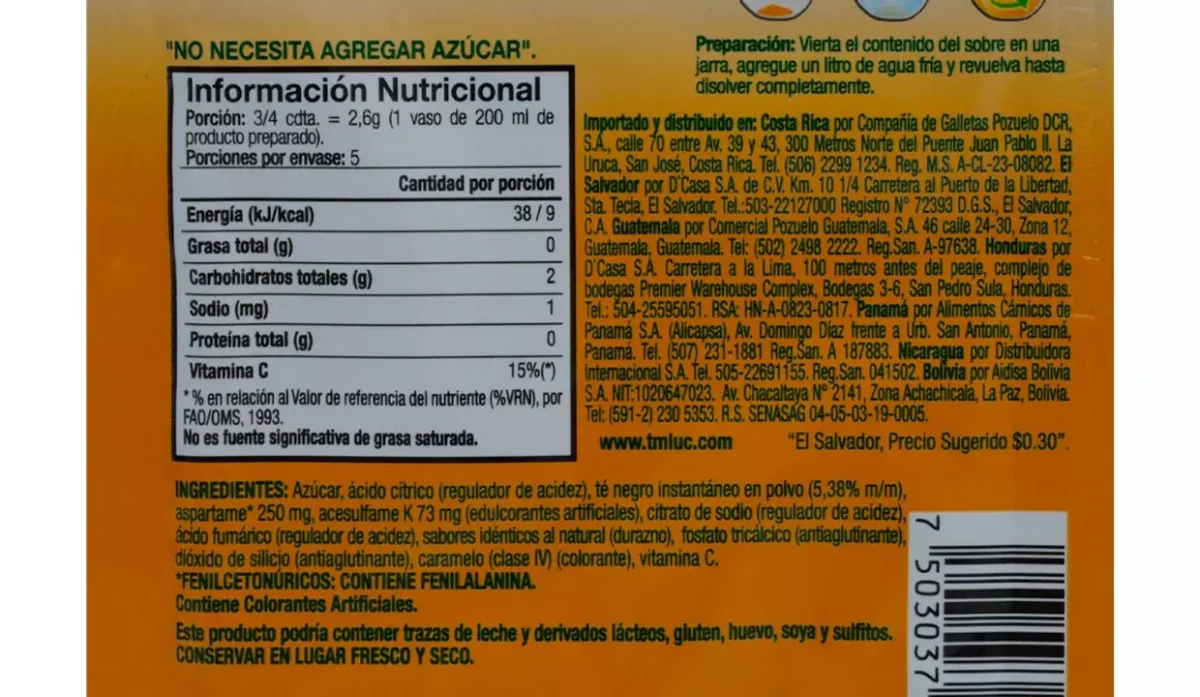 - Azúcar, ácido cítrico (regulador de acidez), té negro instantáneo en polvo, aspartame, acesulfame (colorantes artificiales), citrato de sodio (regulador de acidez), ácido fumárico (regulador de acidez), sabores idénticos al natural (durazno), fisfato tricálcico (antiaglutinante), dióxido de silicio (antiglutinante), caramelo clase VI, vitamina C.