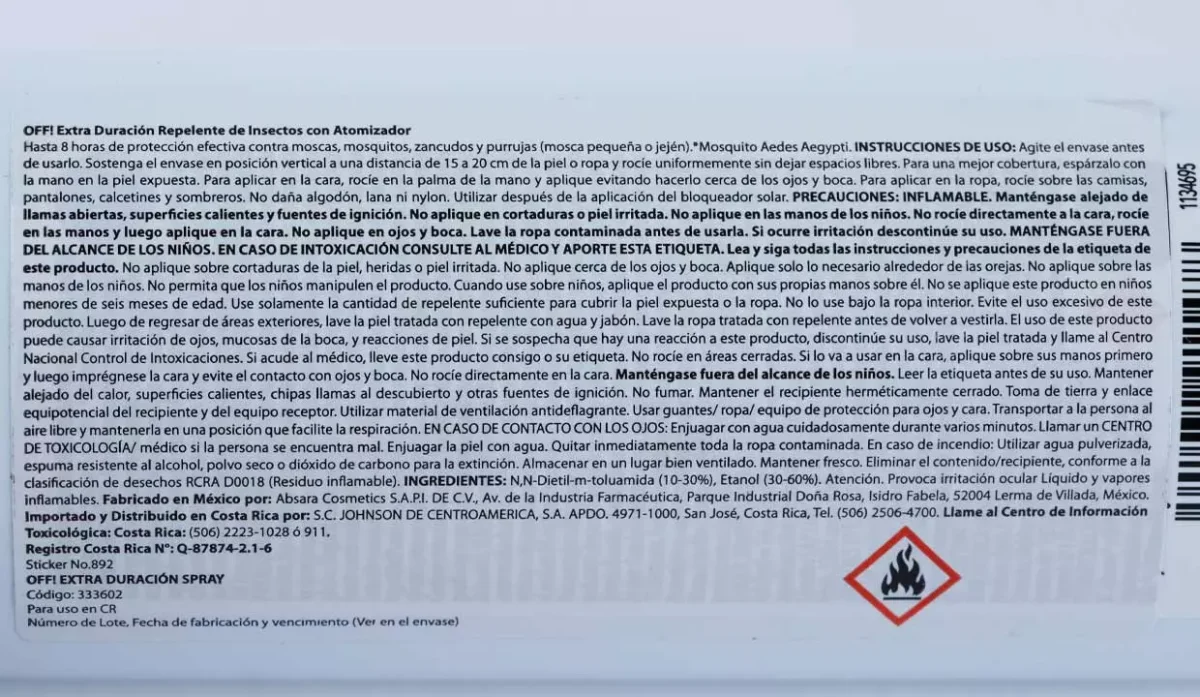 - Alcohol etílico (40-60%), deet (10-30%), butano (5-10%), propano (1-5%), isobutano (1-5%).