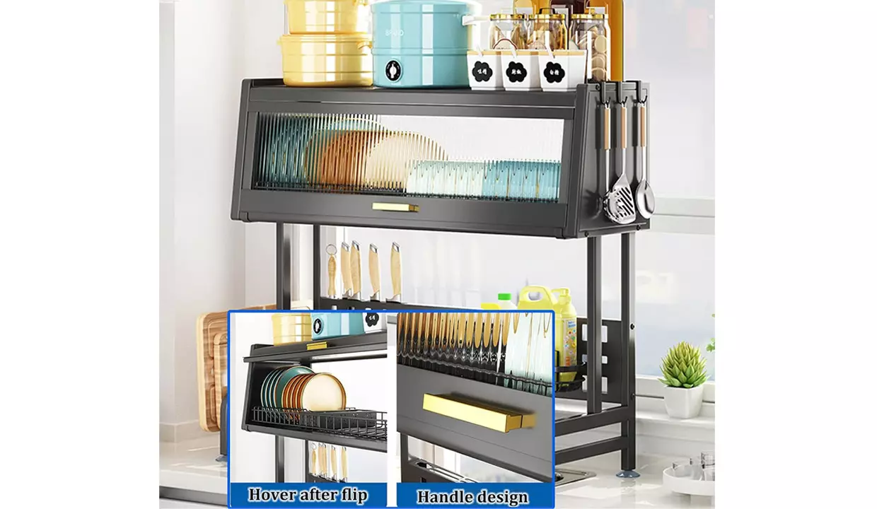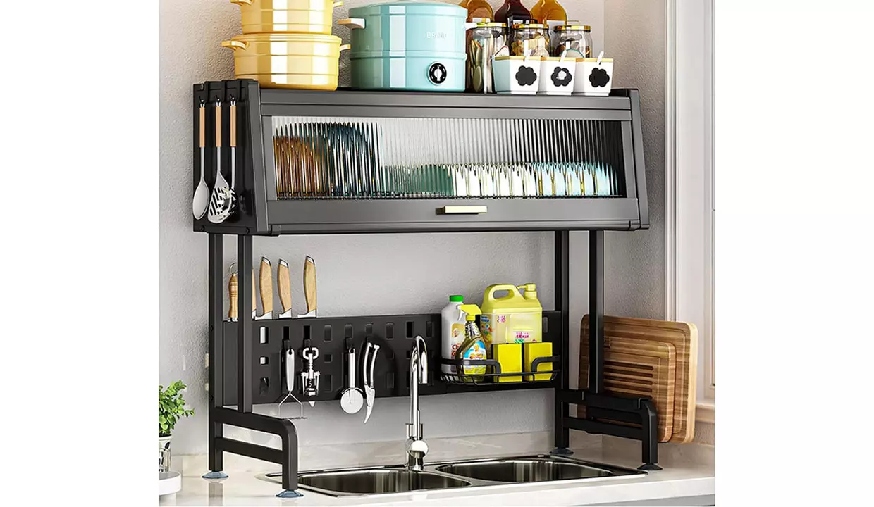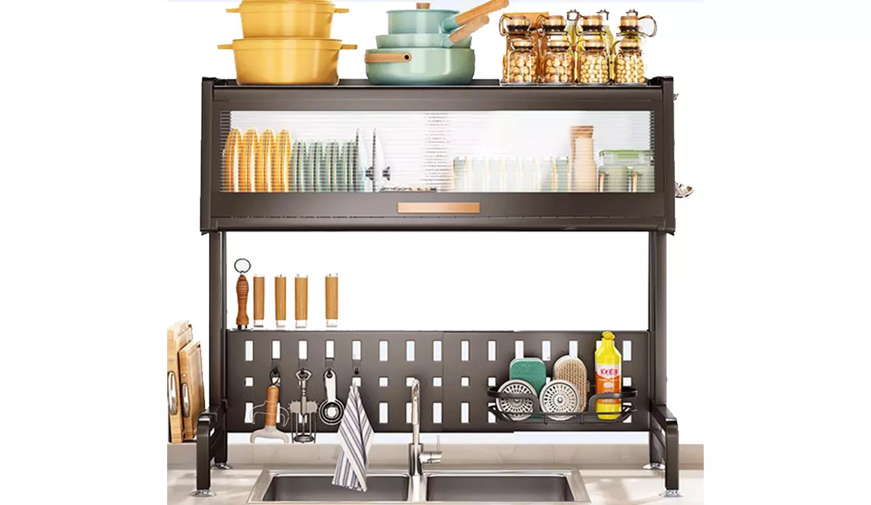 - Los soportes y compartimentos ajustables brindan almacenamiento para utensilios, tablas de cortar e incluso copas de vino.