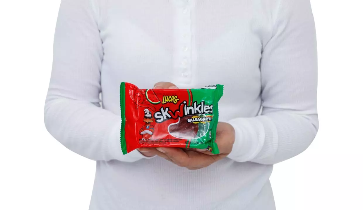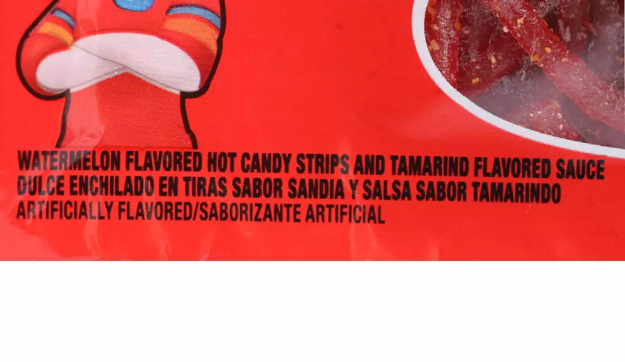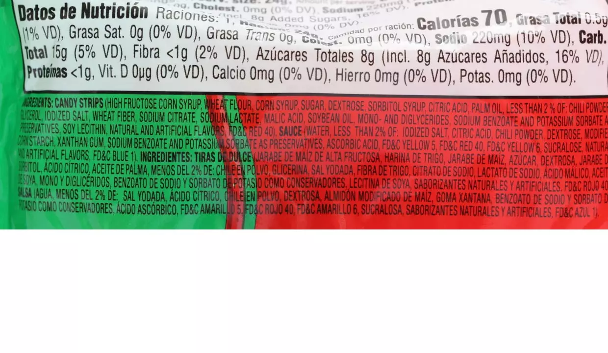 - Tiras de dulce, jarabe de maíz de alta fruxtosa, harina de trigo, jarabe de maíz azúcar, dextrosa, jarabe de sorbitol, ácido cítrico, aceite de palma, chile en polvo, glicerina, sal yodada, fibra de trigo, citrato de sodio, lactato de sodio, ácido málico, aceite de soya, mono y diglicéridos, benzoato de sodio y sorbato de potasio, lecitina de soya, saborizantes naturales y artificiales.