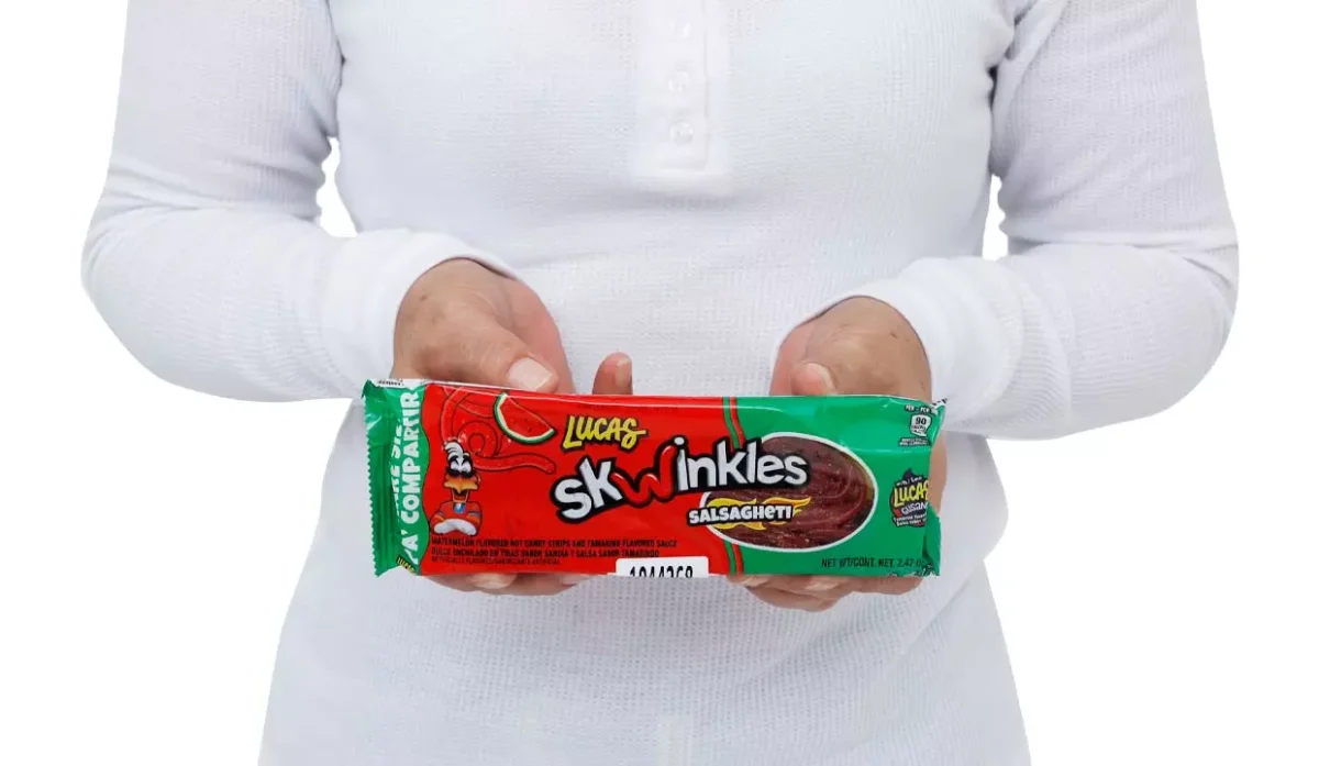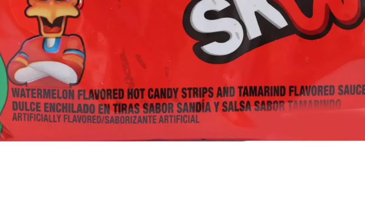 - Tiras de dulce, jarabe de maíz de alta fruxtosa, harina de trigo, jarabe de maíz azúcar, dextrosa, jarabe de sorbitol, ácido cítrico, aceite de palma, chile en polvo, glicerina, sal yodada, fibra de trigo, citrato de sodio, lactato de sodio, ácido málico, aceite de soya, mono y diglicéridos, benzoato de sodio y sorbato de potasio, lecitina de soya, saborizantes naturales y artificiales.