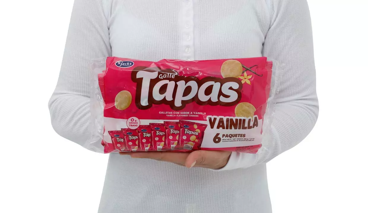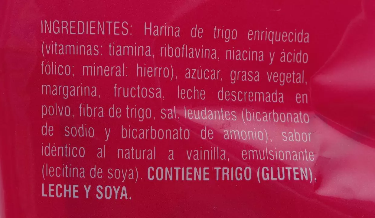 - Harina de trigo enriquecida, azúcar, grasa vegetal, margarina, tapa de dulce granulada, fructosa, leche descremada en polvo, fibra de trigo, sal, sabor idéntico al natural de vainilla.