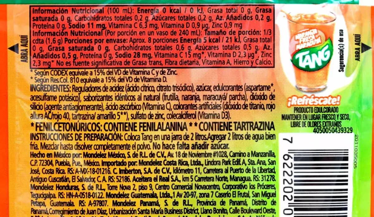 - Reguladores de acidez, ácido cítrico, citrato trisódico, azúcar, edulcorantes, aspartame, asesulfame potásico, saborizante idénticos al natural frutilla, naranja y maracuyá, parcha, dióxido de silicio, agente antiglomerante, ácido ascórbico, vitamina c, colorantes artificiales, dióxido de titanio, rojo altura, rojo 40, tartrazina, amarillo 5, sulfato de zinc, colecalciferol, vitamina D3,.