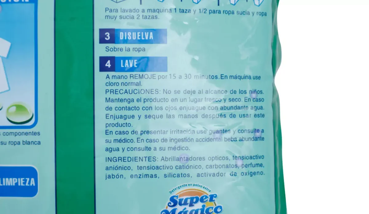 - No deteriora los tejidos, gracias a sus átomos de oxígeno que en contacto con el agua activan su poder extra limpiador.