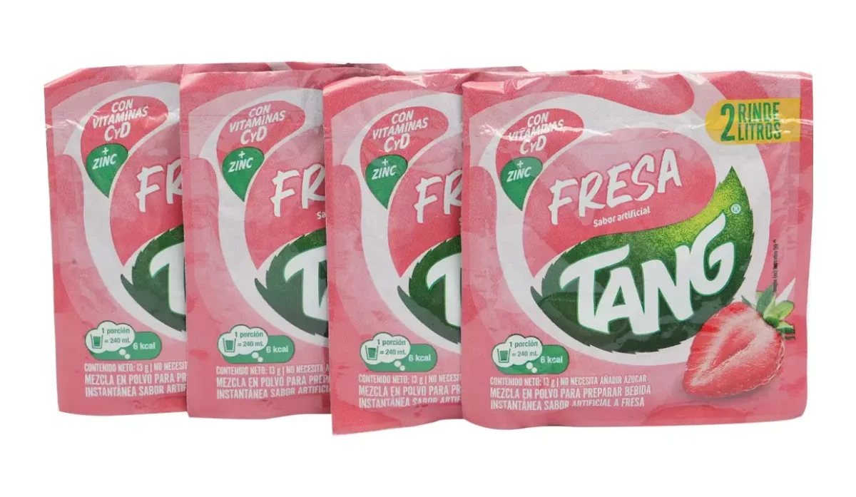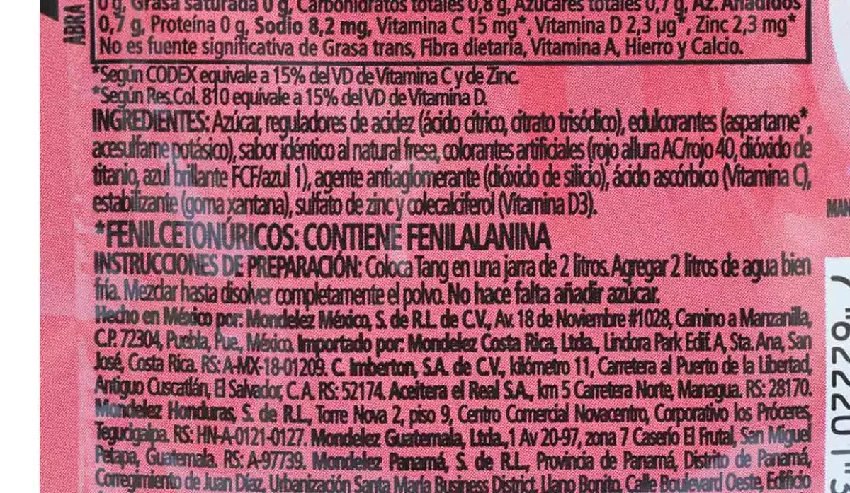 - Reguladores de acidez, ácido cítrico, citrato trisódico, azúcar, edulcorantes, aspartame, asesulfame potásico, saborizante idénticos al natural fresa, colorantes artificiales, dióxido de titanio, rojo altura, rojo 40, azul brillante 1, dióxido de silicio, agente antiglomerante, ácido ascórbico, vitamina C, sulfato de zinc, colecalciferol, vitamina D3.