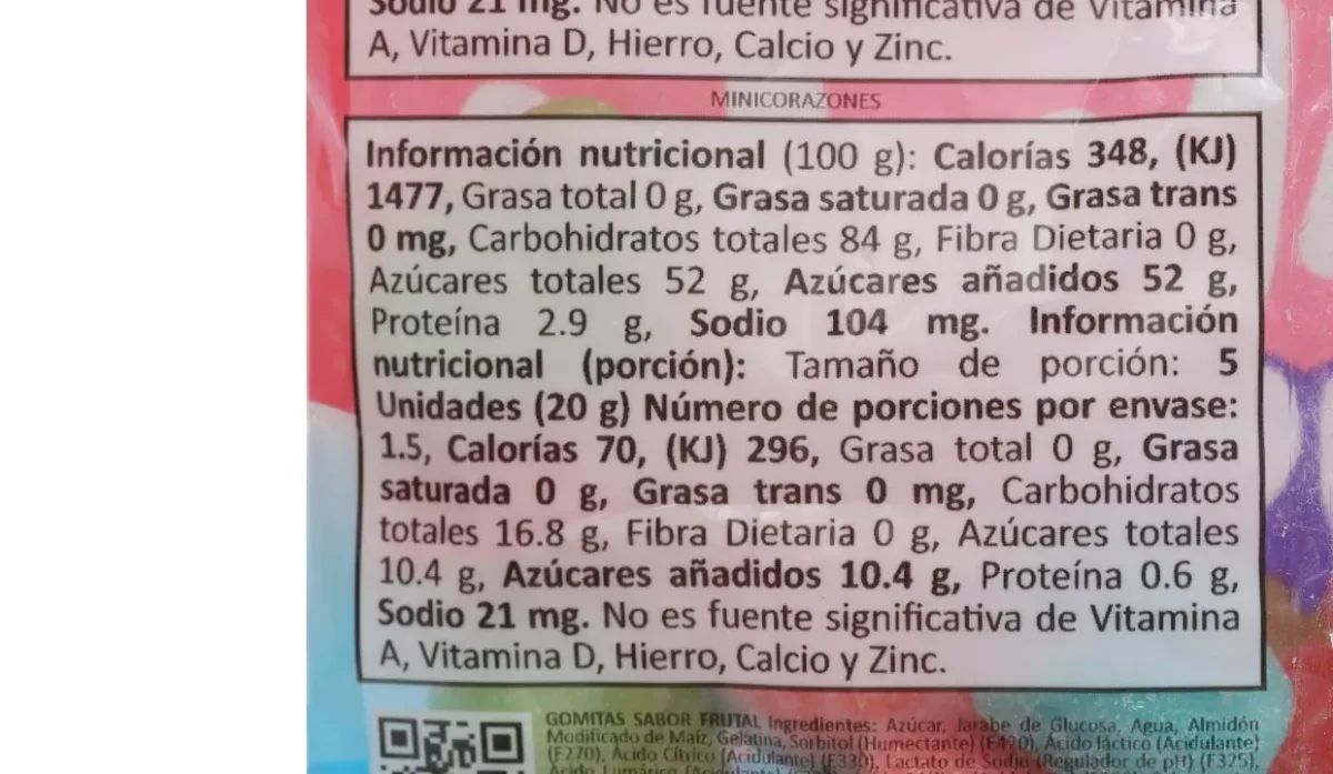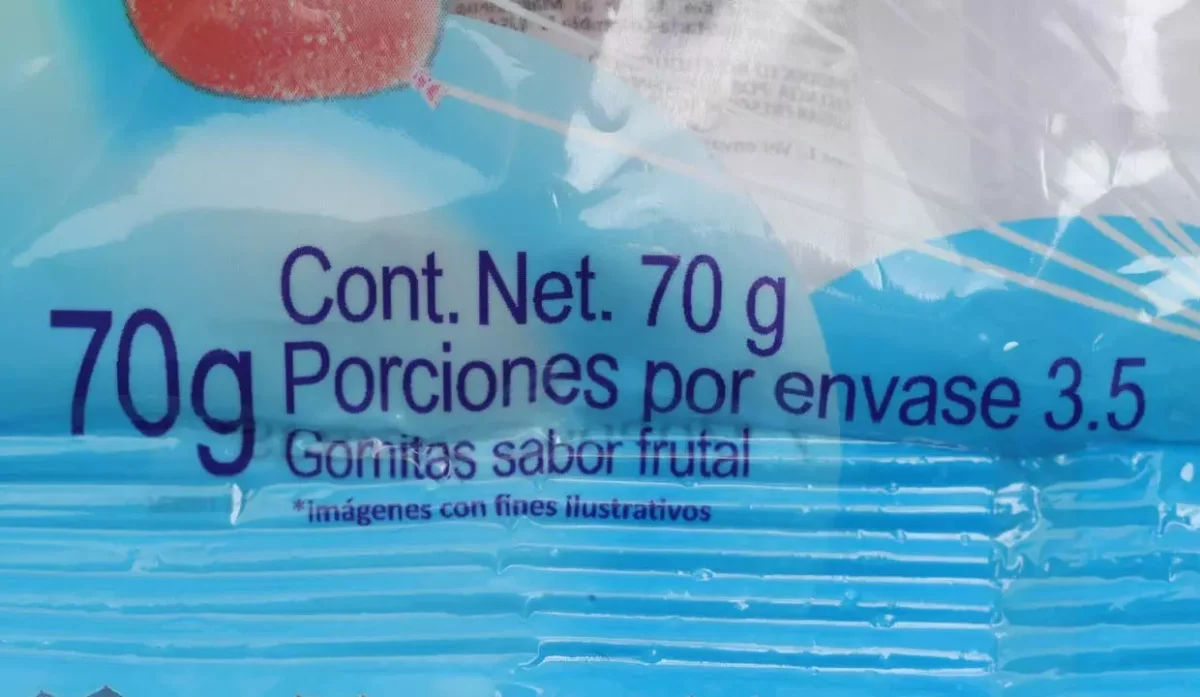 - Azúcar, jarabe de glucosa, agua, almidón modificado de maíz, gelatina, sorbitol, ácido láctico, ácido cítrico, lactato de sodio, ácido fumárico, ácido málico, saborizantes artificiales a fresa, mandarina, limón, cereza y manzana, dióxido de titanio, glicerina, colorantes artificiales rojo no 40, azul n1, amarillon5.