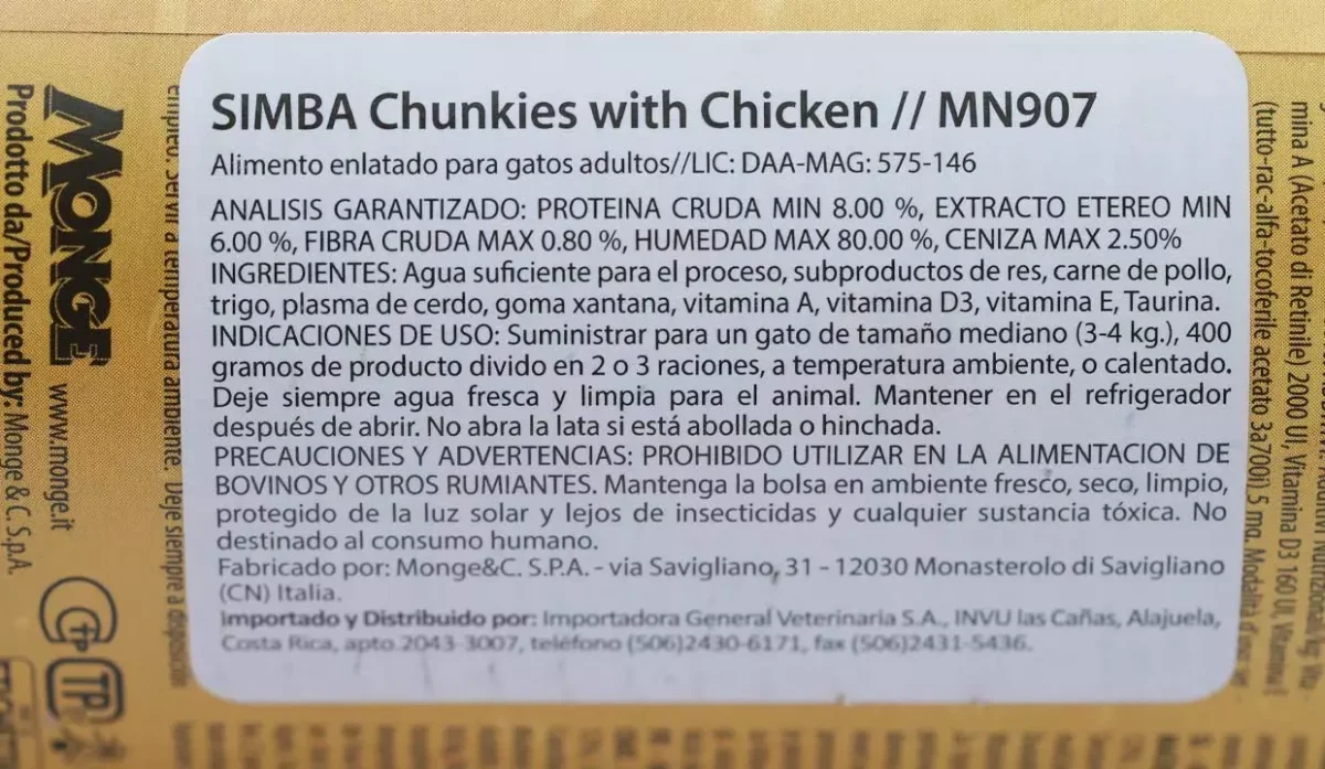 - Agua suficiente para el proceso, subproductos de res, carne de pollo, trigo, plasma de cerdo, goma xantana, vitamina A, vitamina D3, vitamina E, taurina.
