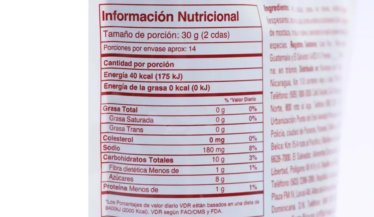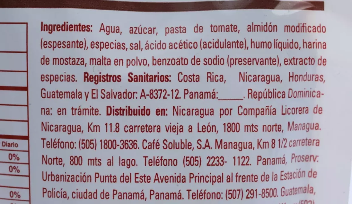 - Agua, azúcar, pasta de tomate, almidón modificado (espesante), especias, sal, ácido acético (acidulante), jumo líquido, harina de mostaza, malta en polvo, benzoato de sodio (preservante), extracto de especias.