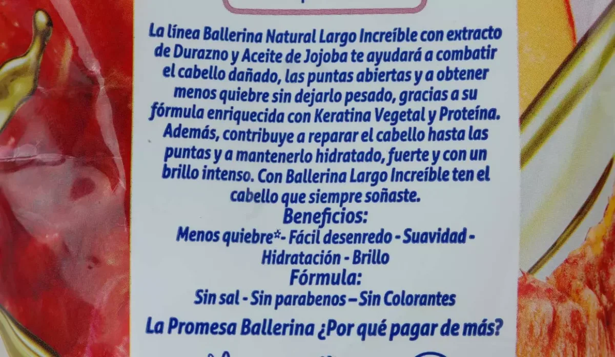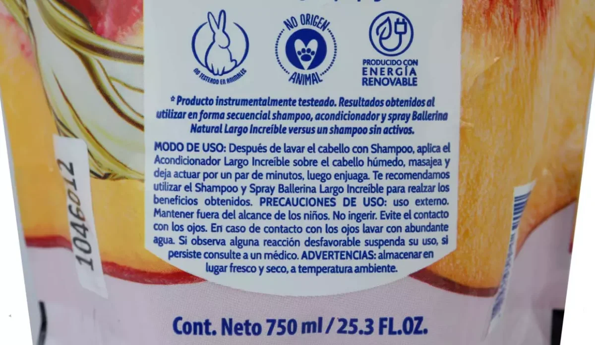 - Agua, alcohol cetílico, cloruro de cetrimonio, dimenticonol, dodecilbencenosulfonato, perfume, metilcloroisotiazolina, metilisotiazolinona, cloruro de magnesio, nitrato de magnesio, amodimeticona, Tricedeth 12, ácido cítrico, proteína de soja hidrolizada, proteína de maíz hidrolizada, proteína de trigo hidrolizada, aceite de semilla de Simmondsia chinensis (jojoba), propilenglicol, extracto de fruto de Prunus persica (durazno).