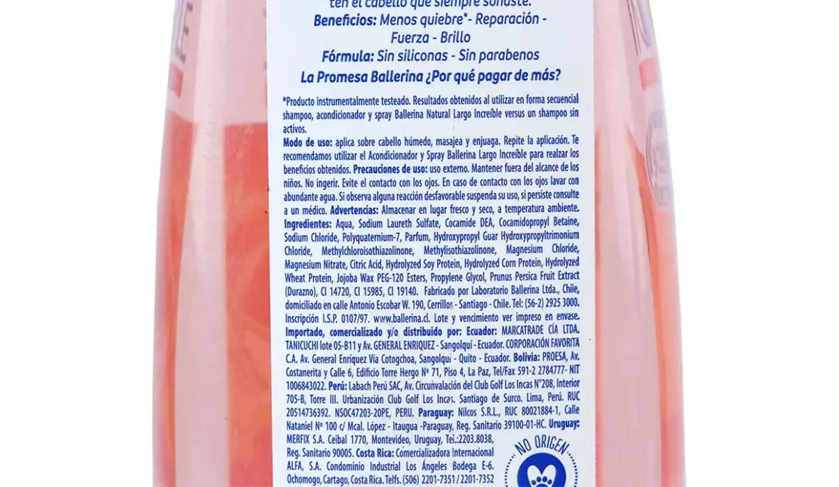 - Agua, alcohol cetílico, cloruro de cetrimonio, dimenticonol, dodecilbencenosulfonato, perfume, metilcloroisotiazolina, metilisotiazolinona, cloruro de magnesio, nitrato de magnesio, amodimeticona, Tricedeth 12, ácido cítrico, proteína de soja hidrolizada, proteína de maíz hidrolizada, proteína de trigo hidrolizada, aceite de semilla de Simmondsia chinensis (jojoba), propilenglicol, extracto de fruto de Prunus persica (durazno).