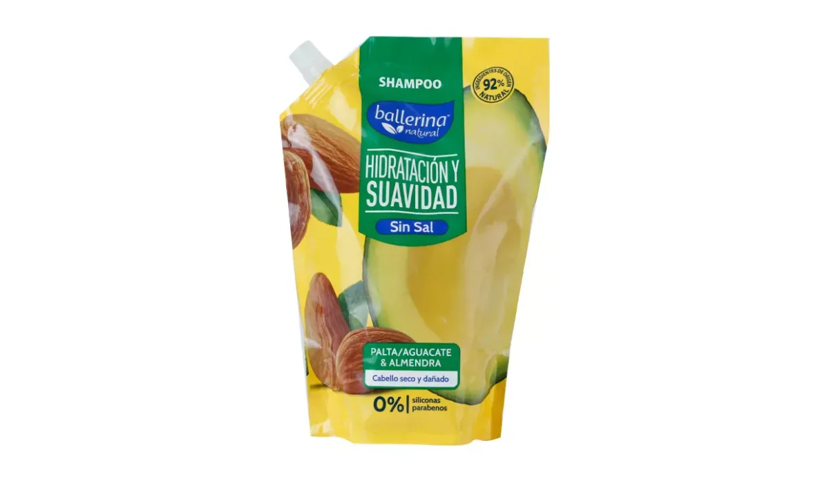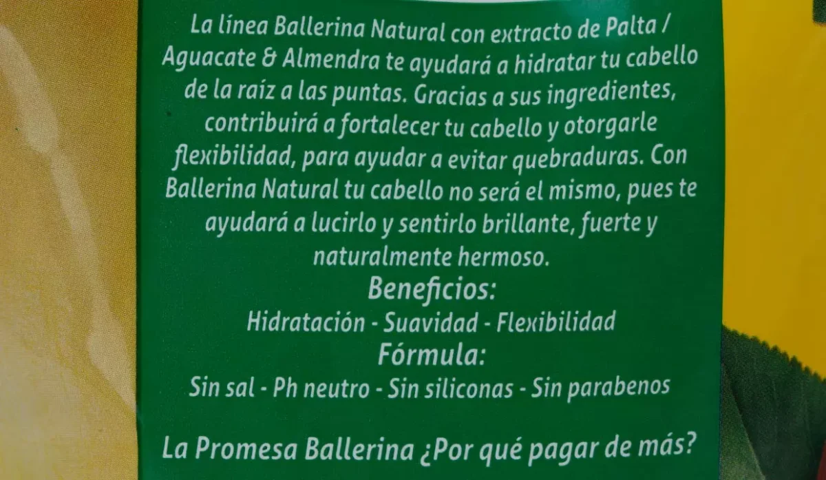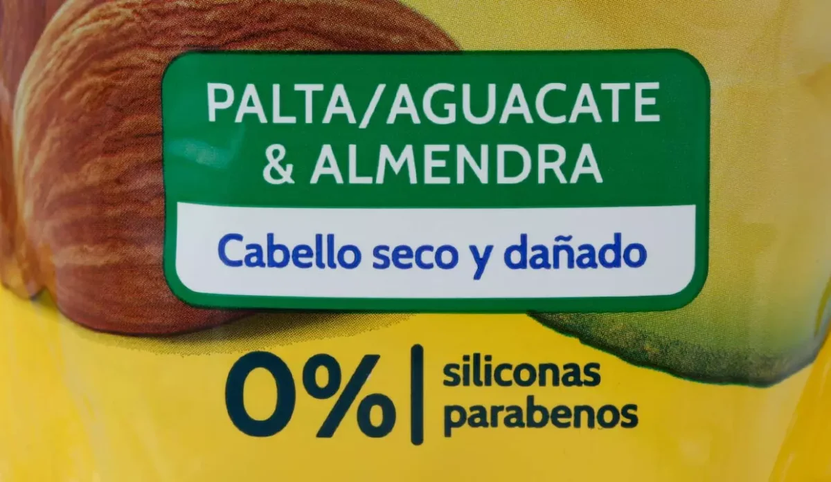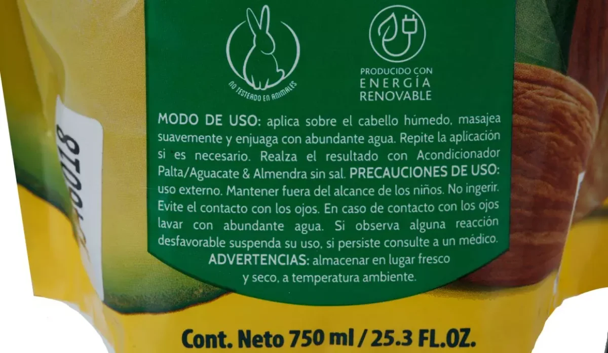 - Agua, lauril éter sulfato de sodio, cocamidopropil betaína, cocamida, perfume, trioleato de metilglucosa, propilenglicol, policuaternio, metilcloroisotiazolinona, metilisotiazolinona, cloruro de magnesio, nitrato de magnesio, ácido cítrico, extracto de fruta de Persea gratissima (palta), extracto de fruta de Prunus amygdalus dulcis (almendra).