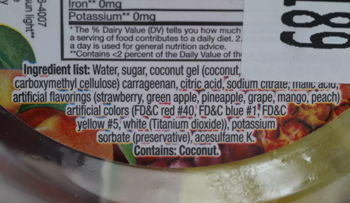 - Agua, azúcar, gel de coco, bicarbonato de sodio, carboximetilcelulosa, carragenina, ácido cítrico, citrato de sodio, ácido málico, saborizantes artificiales (fresa, manzana verde, piña, uva, mango, melocotón),colores artificiales (rojo#40, azul#1, amarillo#5, blanco), dióxido de titanio, sorbato de potasio (conservante), acesulfamo.