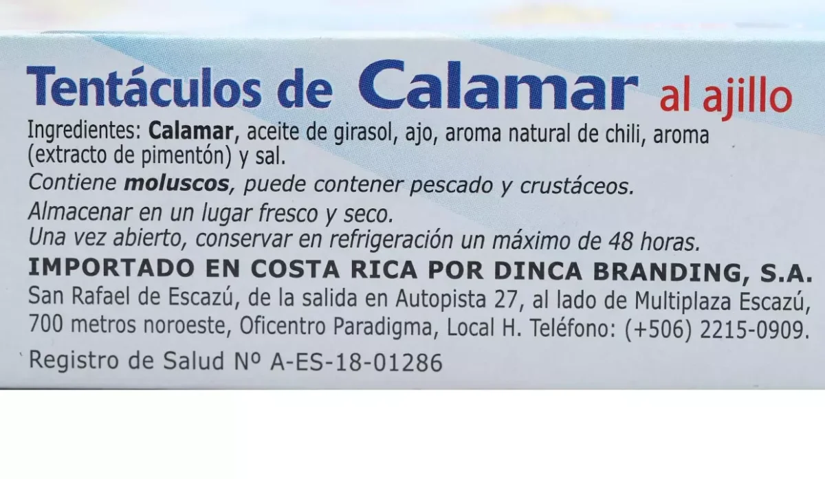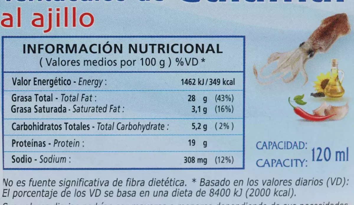 - Calamar, aceite de girasol, ajo, aroma natural de chili, aroma (extracto de pimentón), sal.