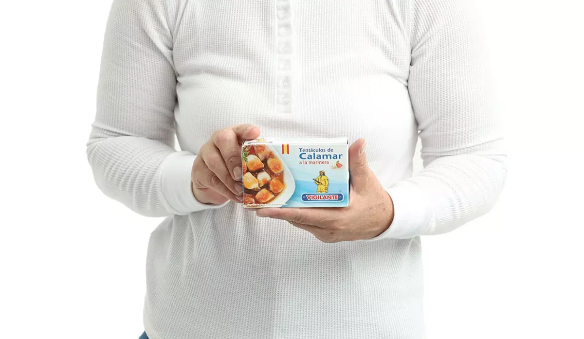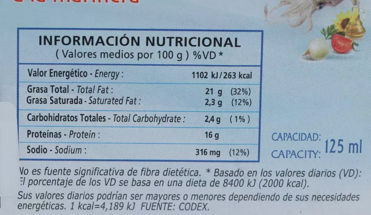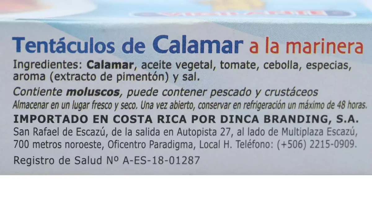 - Calamar, aceite vegetal, tomate, cebolla, especias, aroma (extracto de pimentón), sal.
