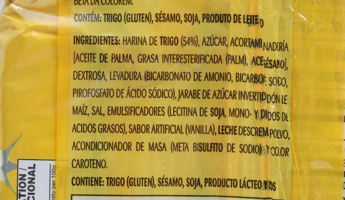 - Harina de trigo 54%, azúcar, aceite de palma, grasa interesterificada, dextrosa, levadura, bicarbonato de amonio, pirofosfato de ácido sódico, jarabe de azúcar invertido, almidón de maíz, sal, emulsificadores, lecitina de soya, mono y diglicéridos de ácidos grasos, sabor artificial a vainilla, leche descremada en polvo, acondicionador de masa, meta bisulfito de sodio.