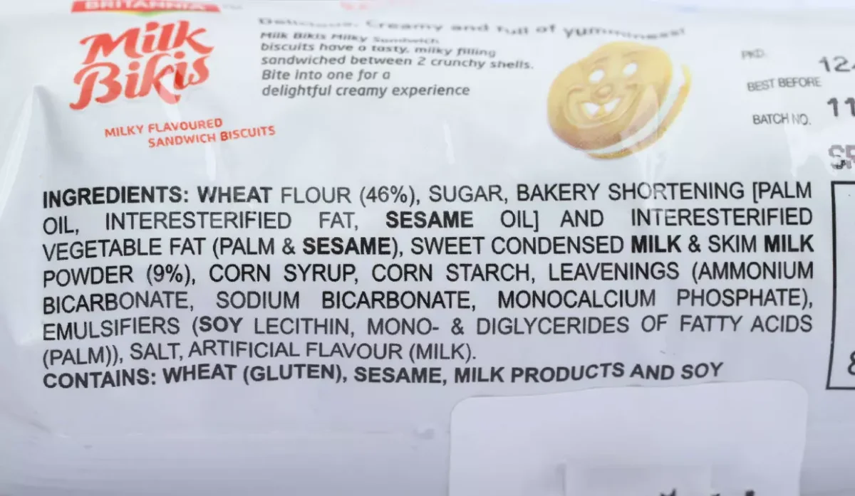 - Harina de trigo (46%), azúcar, manteca vegetal, aceite de palma, grasa interesterificada, aceite de sésamo, grasa vegetal interesterificada, palma y sésamo, leche condensada dulce y leche desnatada en polvo (9%), jarabe de maíz, almidón de maíz, levaduras, bicarbonato de amonio, bicarbonato de sodio, fosfato monocálcico, emulsionantes, lecitina de soja, mono y diglicéridos de ácidos grasos de palma, sal, aroma artificial de leche.
