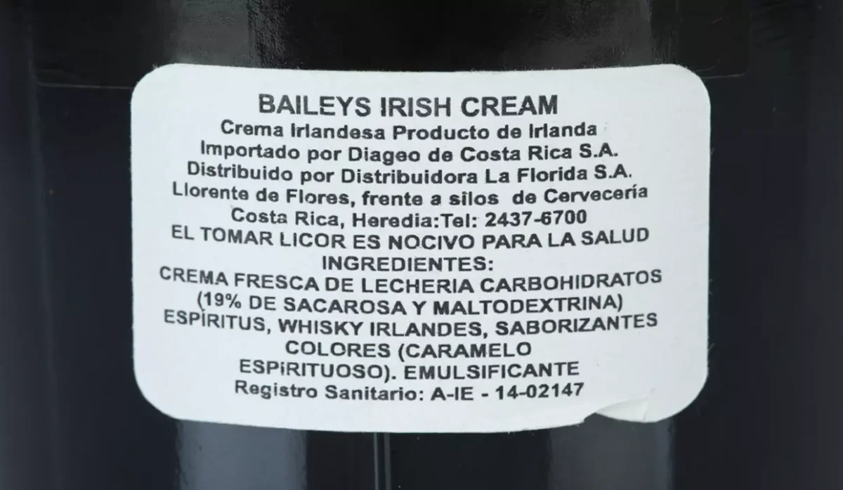 - Crema fresca de lechería carbohidratos. 19% de sacarosa y maltodextrina, espíritus, whisky irlandes, saborizantes colores caramelo espirituoso, emulsificante.